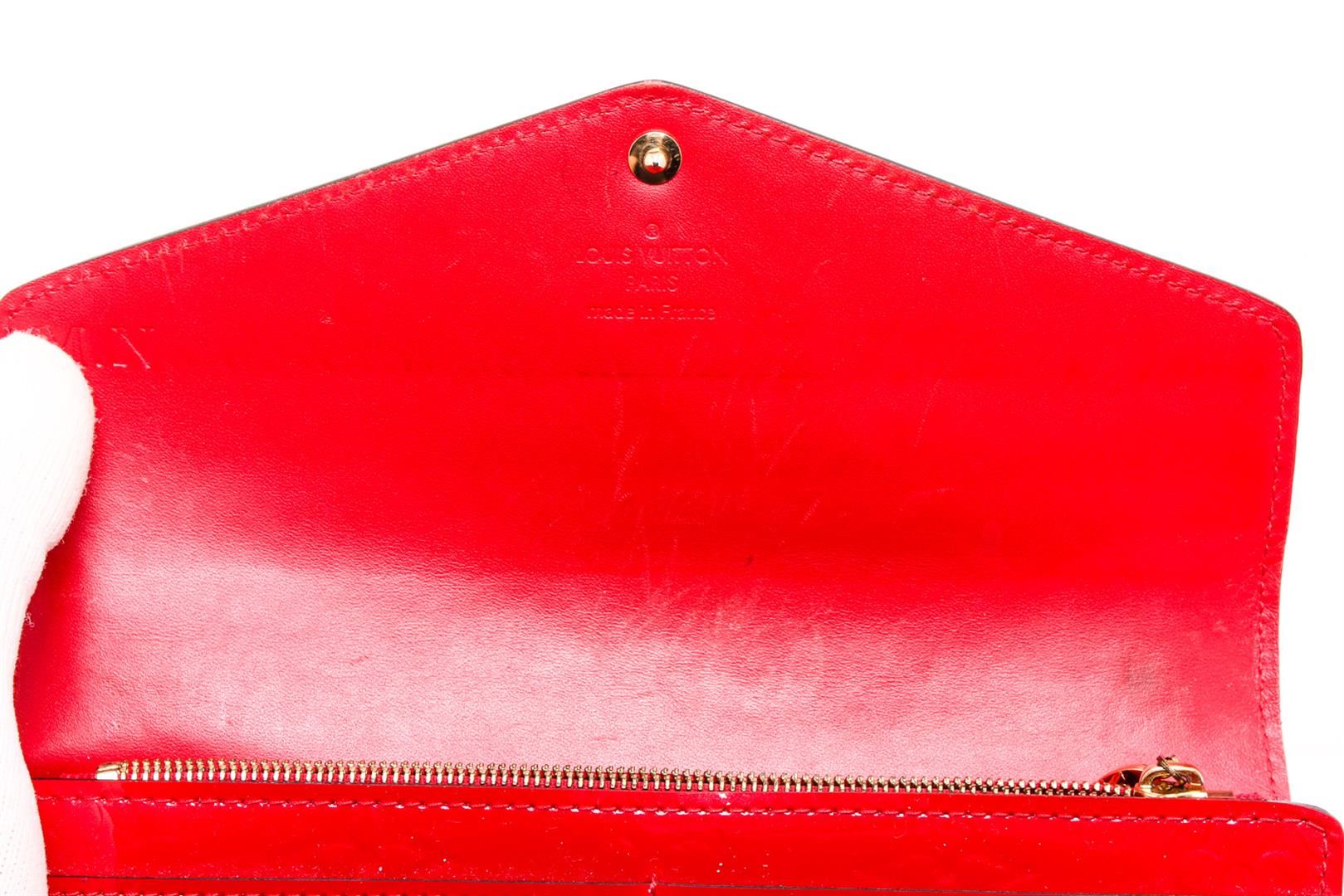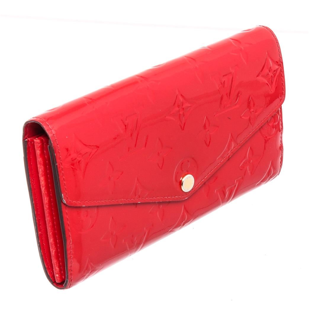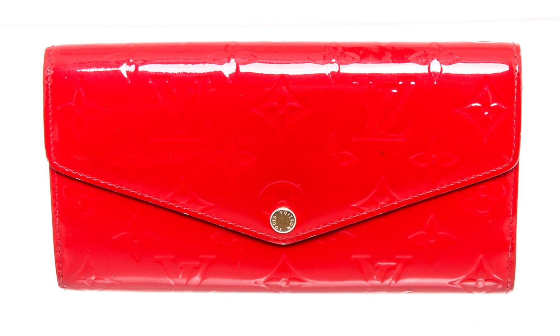 Red monogram Vernis patent leather Louis Vuitton Sarah Wallet with gold-tone hardware, single slip pocket at exterior back, four card slots at flap underside, tonal leather lining, three interior compartments; one with zip closure, single interior bill compartment, twelve card slots and snap closure at front flap. Please note: Initials M.N. stamped on interior flap.