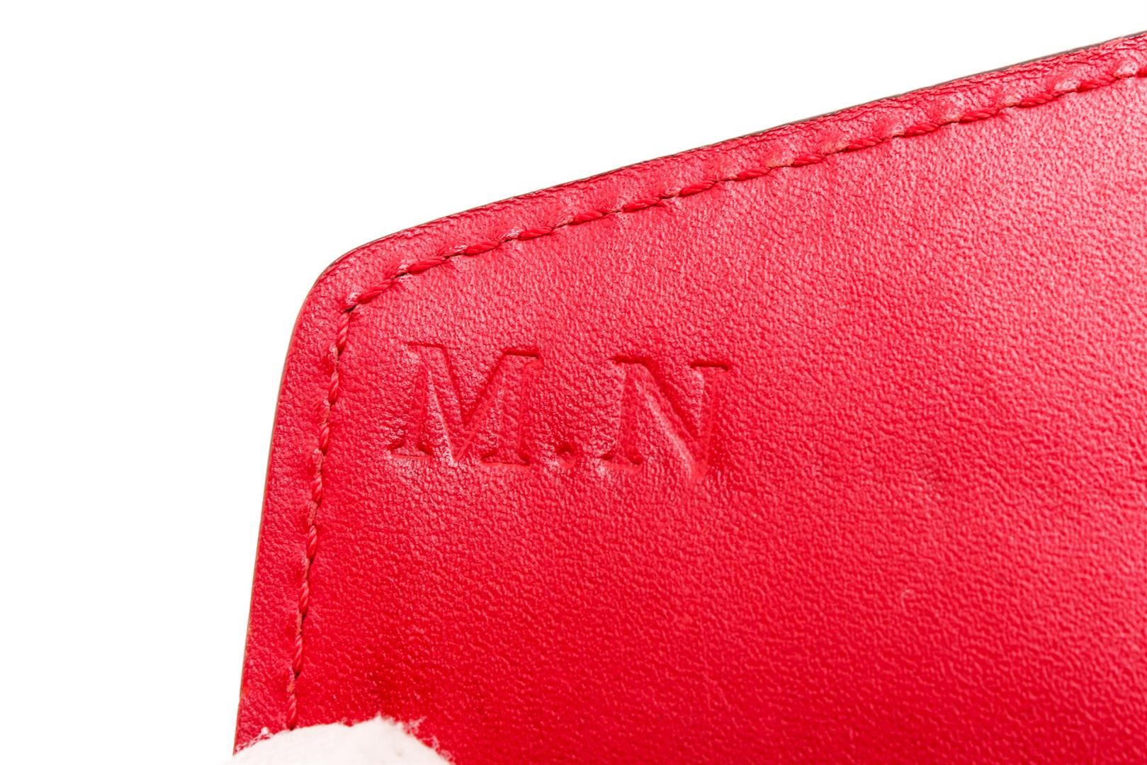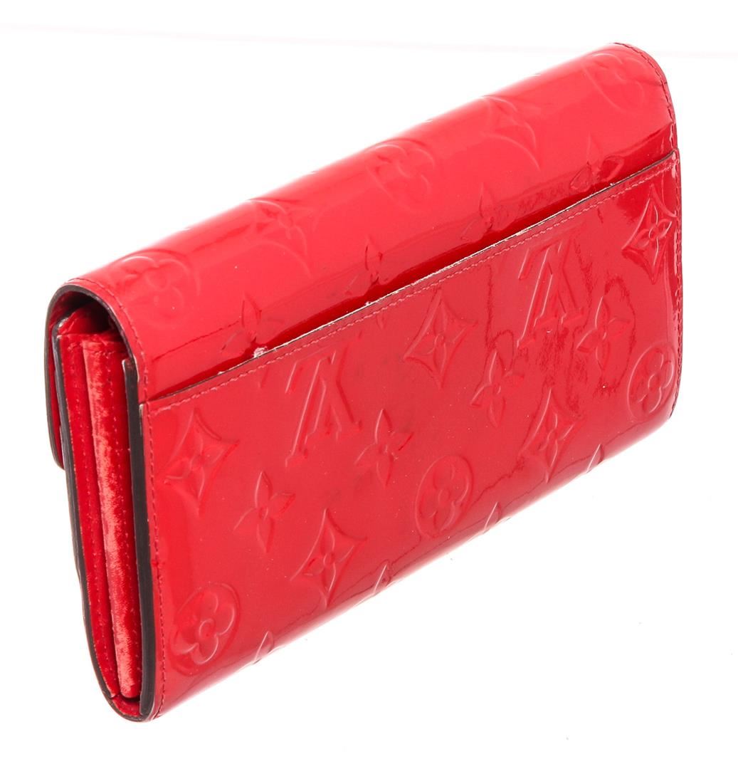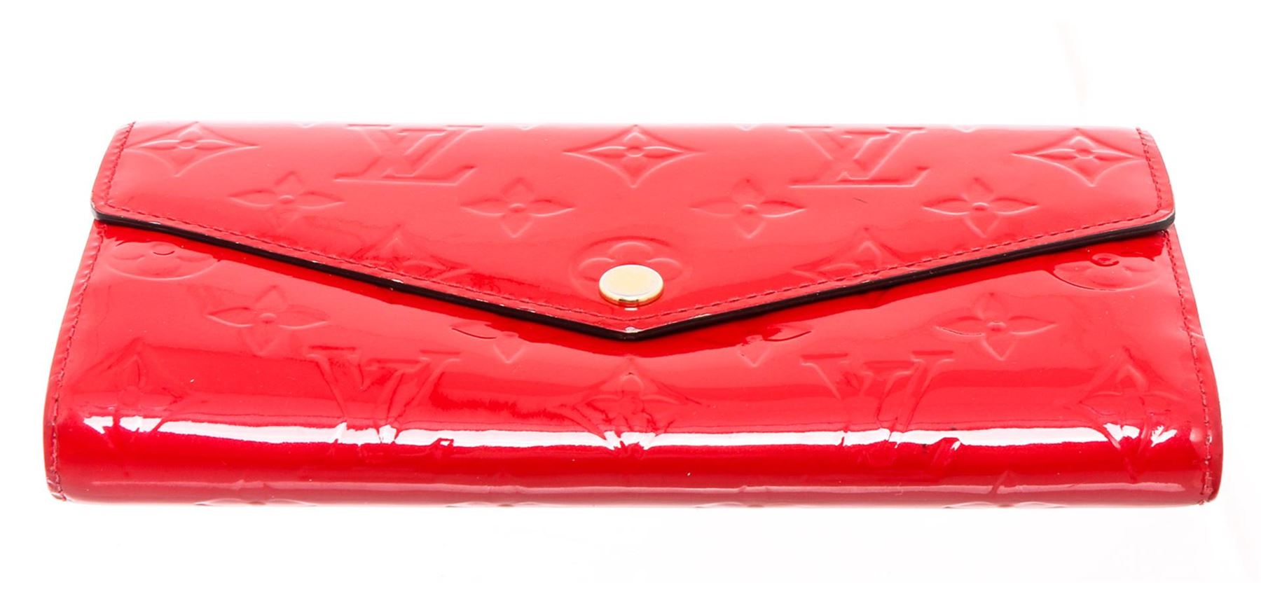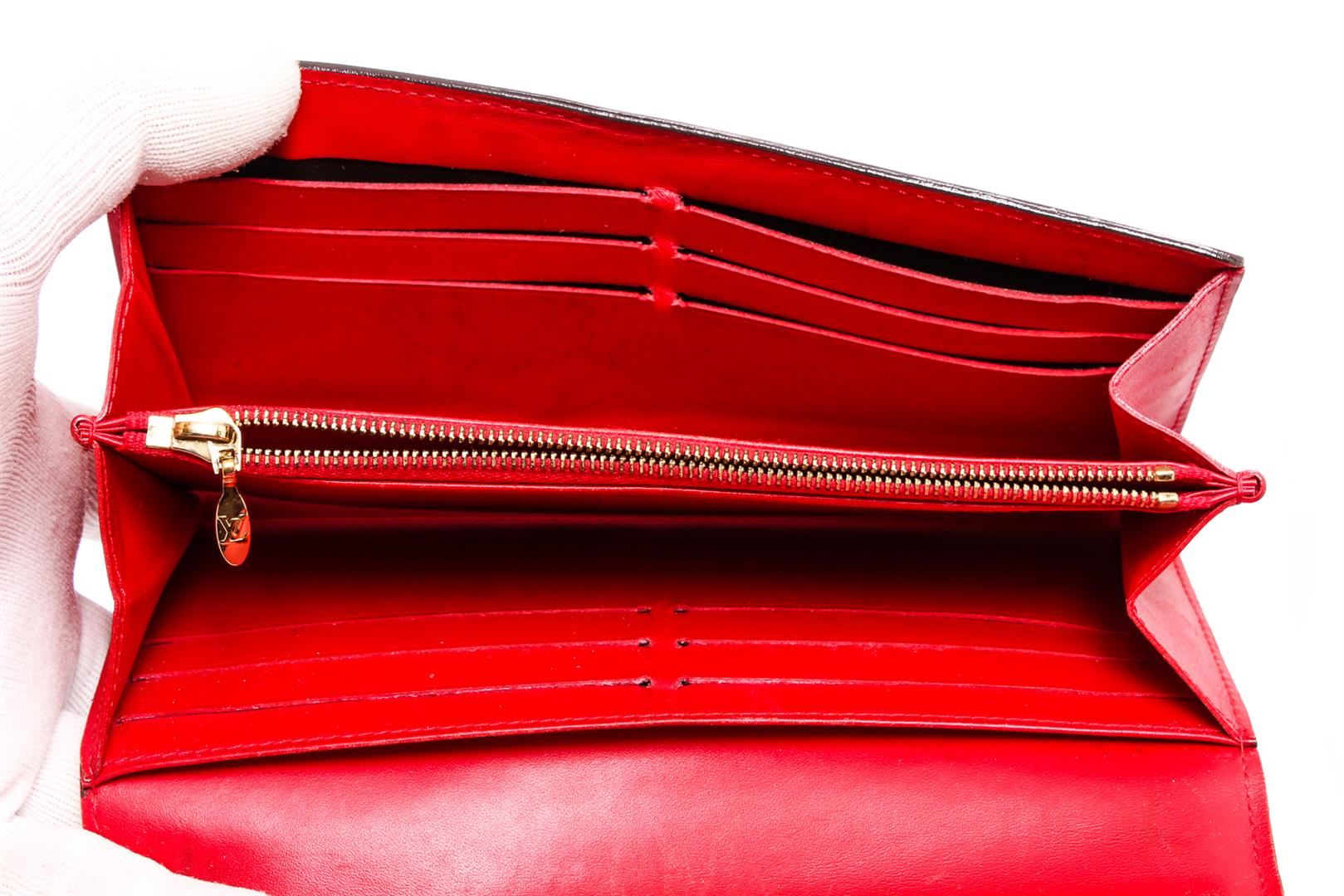 Red monogram Vernis patent leather Louis Vuitton Sarah Wallet with gold-tone hardware, single slip pocket at exterior back, four card slots at flap underside, tonal leather lining, three interior compartments; one with zip closure, single interior bill compartment, twelve card slots and snap closure at front flap. Please note: Initials M.N. stamped on interior flap.