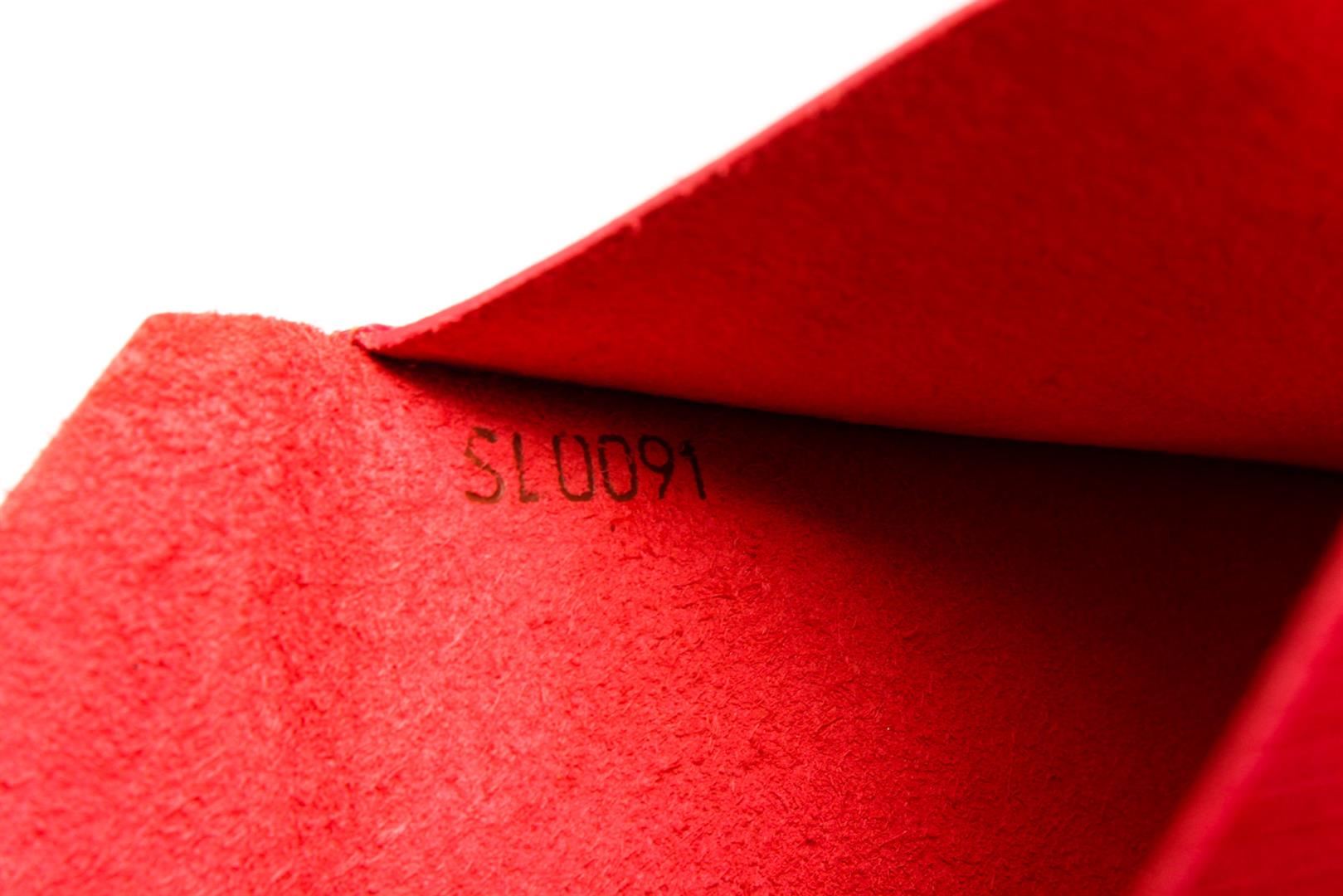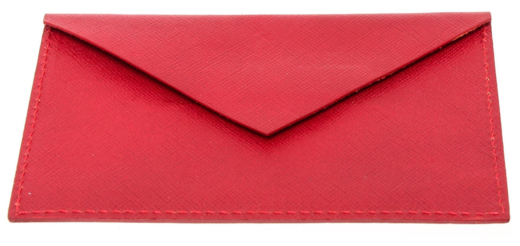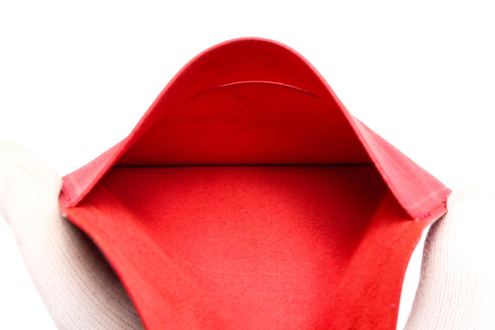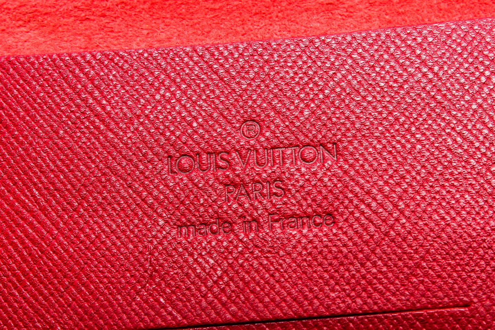 Louis Vuitton red Taiga leather envelope case, embossed logo at back, red suede interior lining, front envelope flap tucks in for closure.