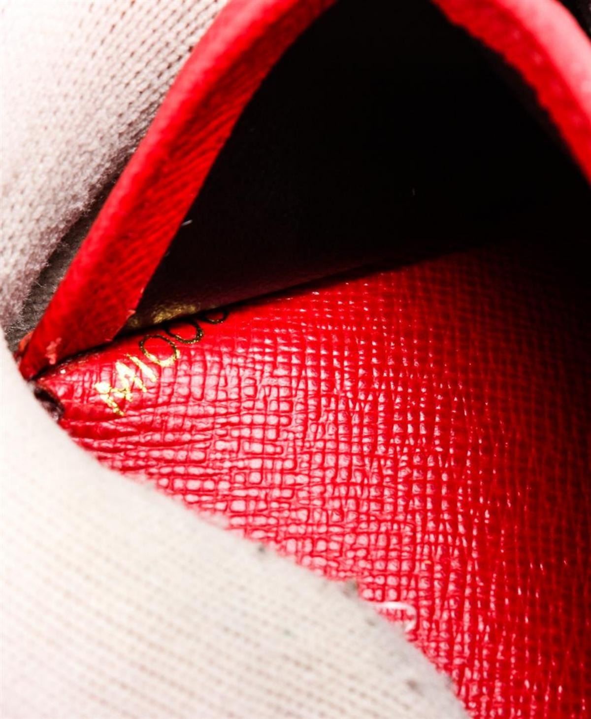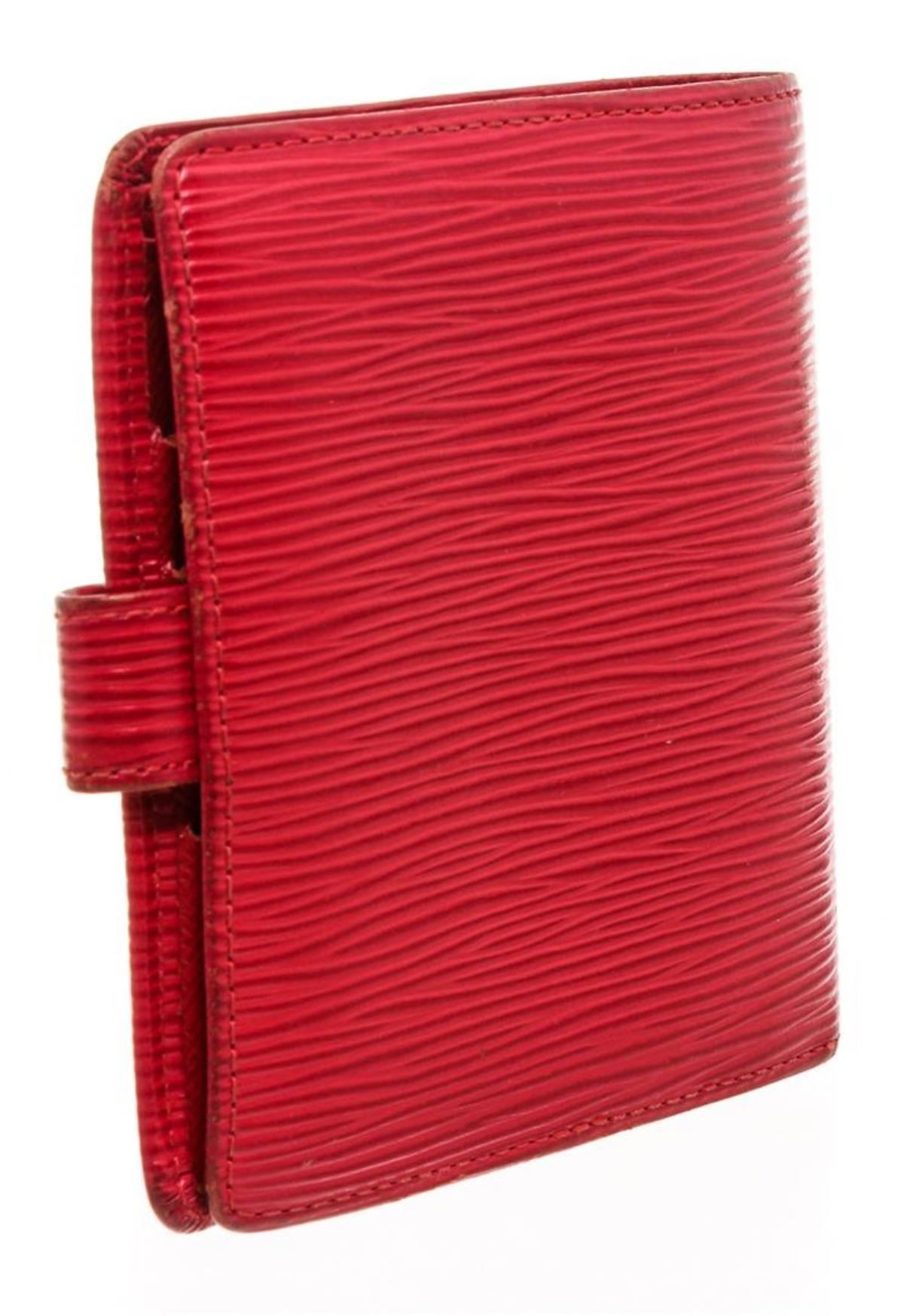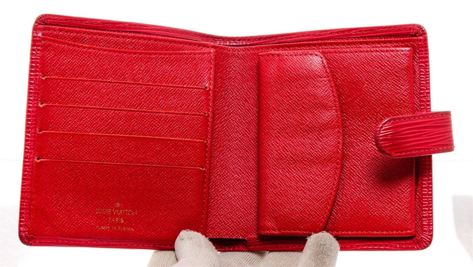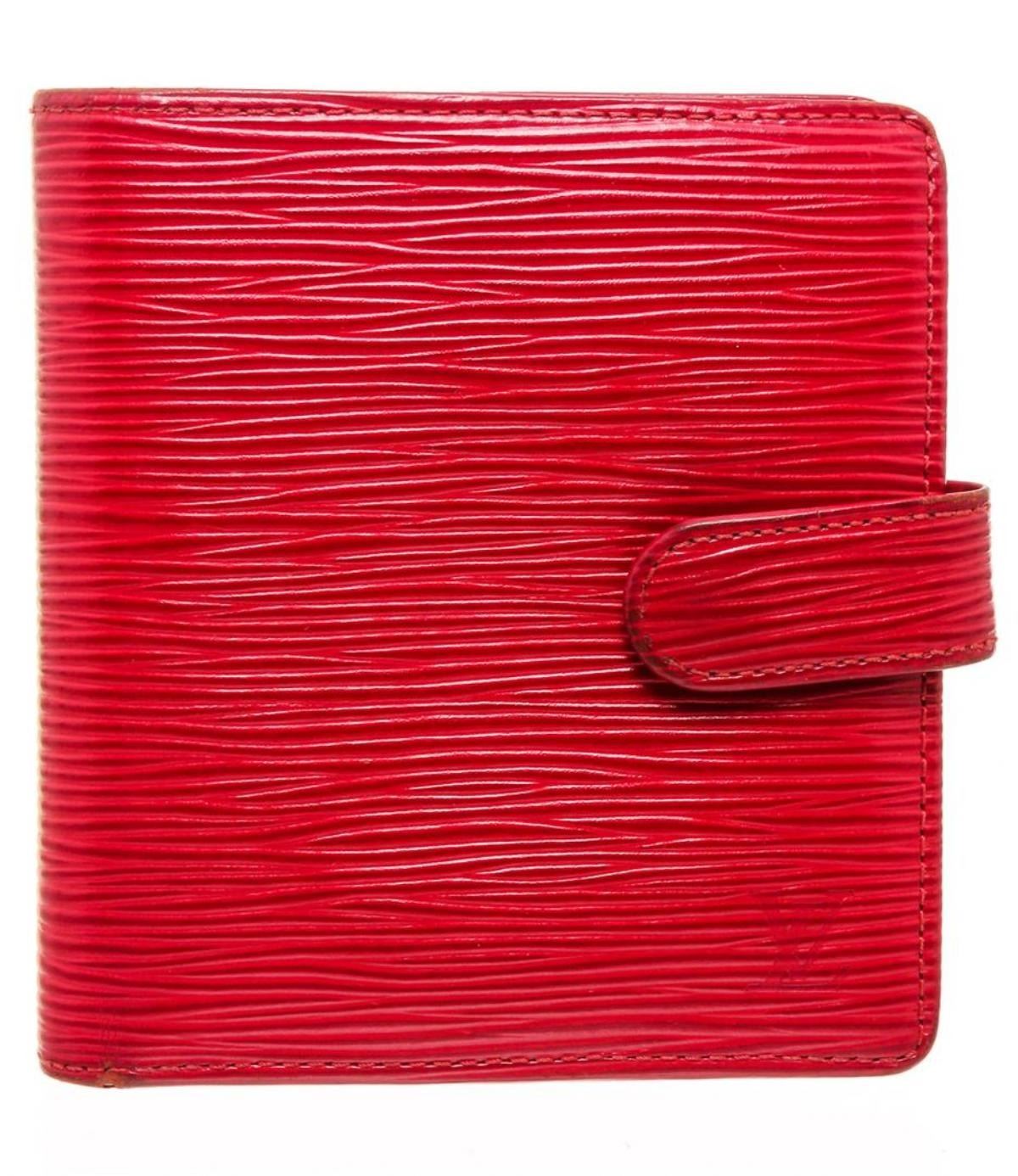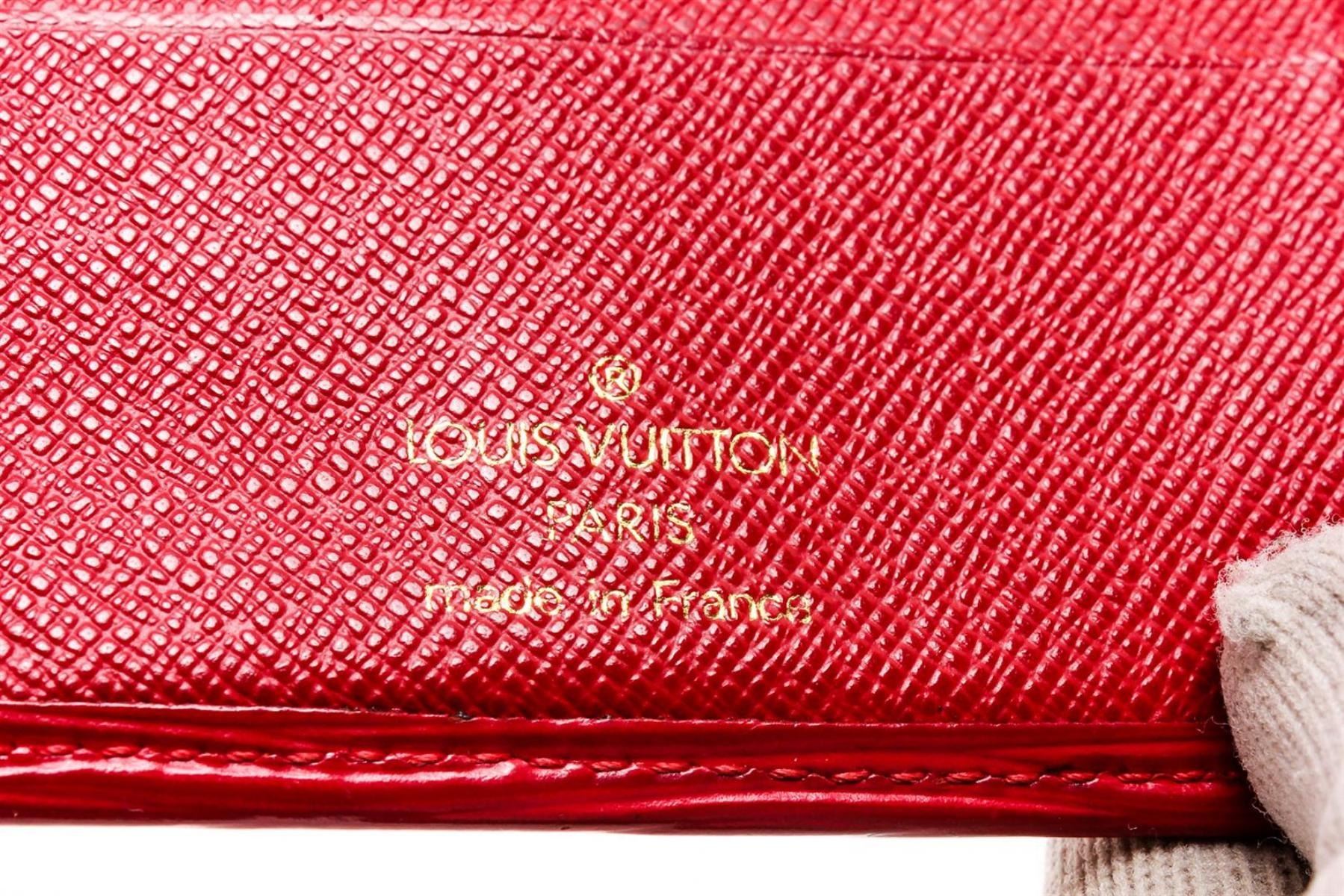 Rouge Epi leather Louis Vuitton Epi Porte Billets compact wallet with brass hardware, embossed logo at front, tonal leather lining, four card slots at interior walls, dual slip pockets, single flap coin compartment, single bill compartment and snap closure at side strap.