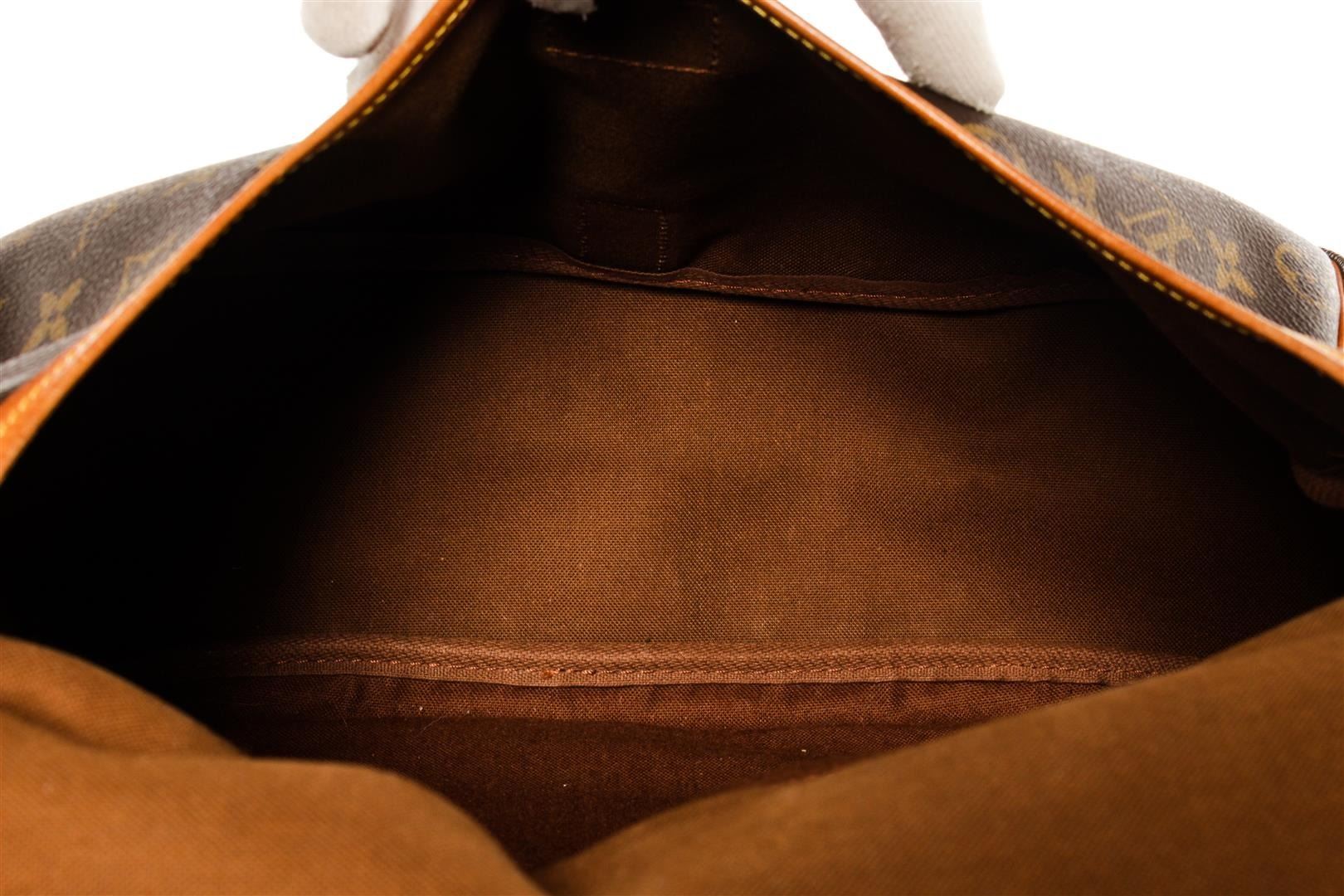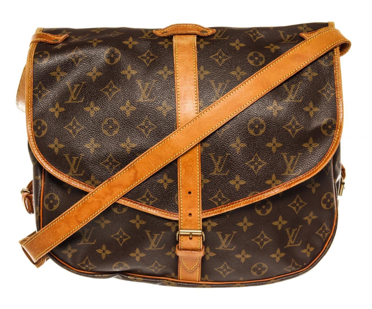 One Louis Vuitton Saumur 35cm. Item is sold AS-IS. All available information is listed in the description and shown in the photo. Brown and tan monogram coated canvas Louis Vuitton Saumur 35 with gold-tone hardware, tan vachetta leather trim, single adjustable flat shoulder strap, brown canvas lining, dual compartments, three pockets at interior walls and dual buckle closures at exterior flap.