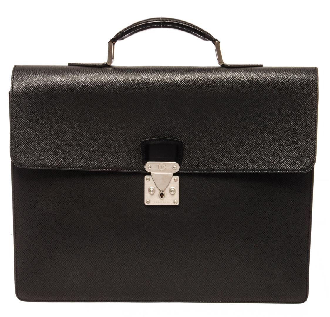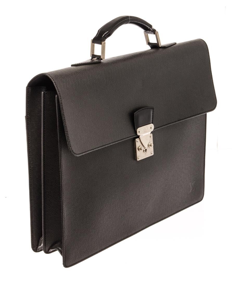 Louis Vuitton Serviette Briefcase Black Taiga Leather. Brand: Louis Vuitton, Style: Serviette, Type: Briefcase, Exterior Color: Black Taiga, Exterior Material: Leather, Exterior Pockets: One, Interior Color: Black, Interior Material: Leather, Interior Pockets: Three, Closure: SN/Ap, Handle/Strap Type: Top Handle, Length: 2, Width: 16, Height: 12, Handle Drop: 2.5. Condition: Piping wear. Item is sold AS-IS and all information pertaining to this lot is available in the photos or this description.