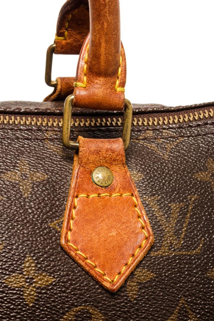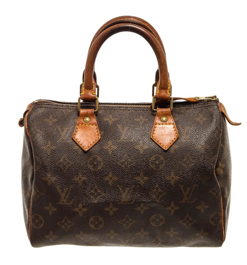 One Louis Vuitton Speedy 25 Handbag. Item is sold AS-IS. All available information is listed in the description and shown in the photo. Louis Vuitton Speedy 25 cm handbag with monogram coated canvas exterior, vanchetta leather top handles, brown fabric lining, one interior slip pocket, top zip closure, and gold-tone hardware.