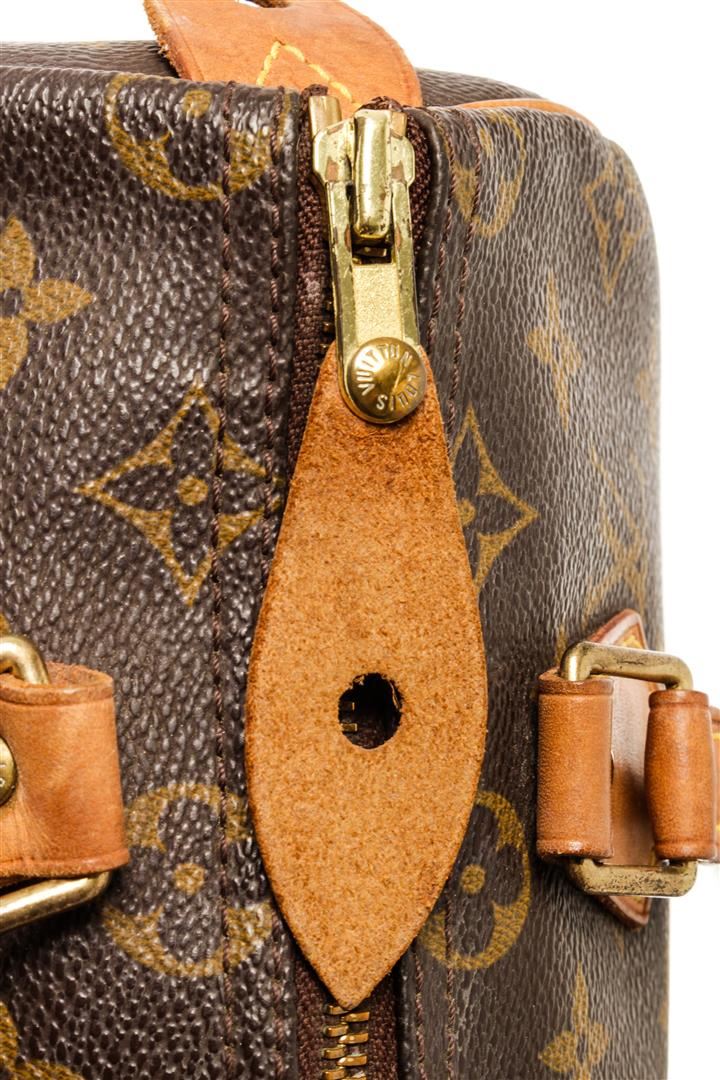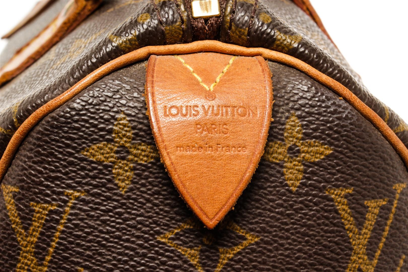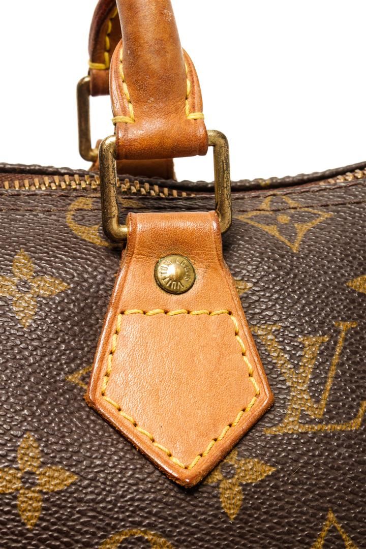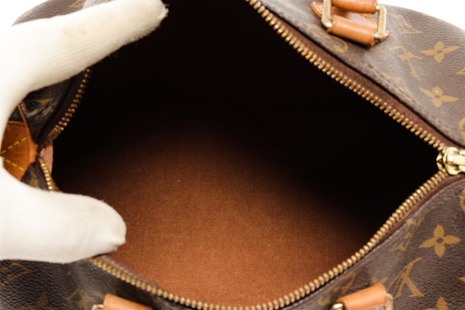 One Louis Vuitton Speedy 25 cm Handbag. Item is sold AS-IS. All available information is listed in the description and shown in the photo. Louis Vuitton Speedy 25 cm handbag with monogram coated canvas exterior, vanchetta leather top handles, brown fabric lining, one interior slip pocket, top zip closure, and gold-tone hardware.