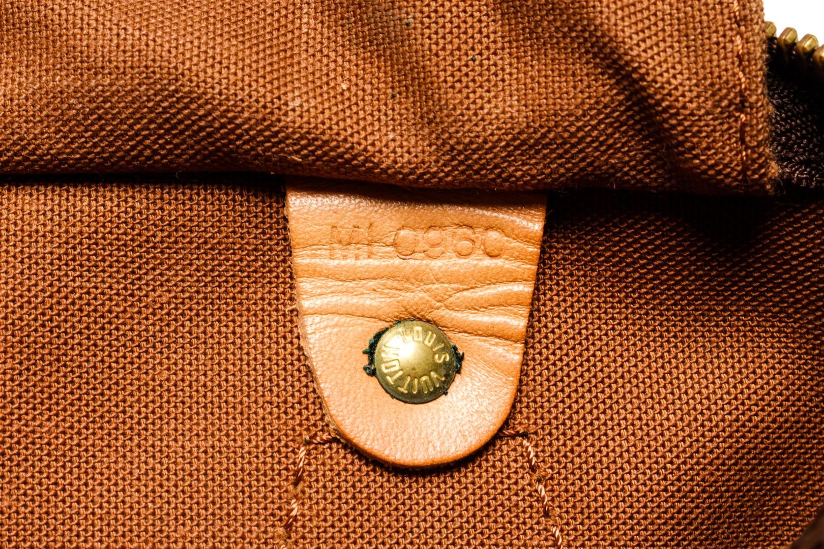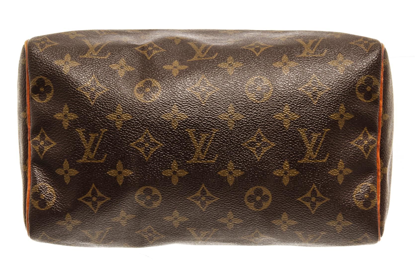 One Louis Vuitton Speedy 25 cm Handbag. Item is sold AS-IS. All available information is listed in the description and shown in the photo. Louis Vuitton Speedy 25 cm handbag with monogram coated canvas exterior, vanchetta leather top handles, brown fabric lining, one interior slip pocket, top zip closure, and gold-tone hardware.