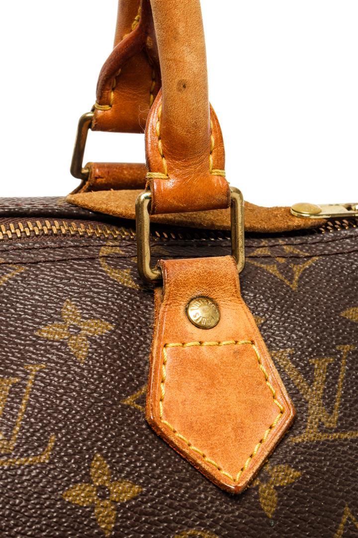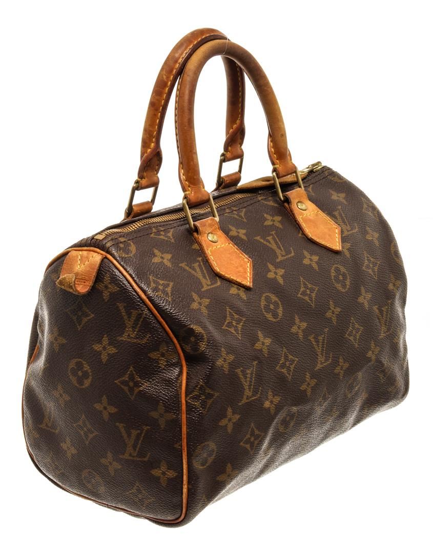 One Louis Vuitton Speedy 25 cm Handbag. Item is sold AS-IS. All available information is listed in the description and shown in the photo. Louis Vuitton Speedy 25 cm handbag with monogram coated canvas exterior, vanchetta leather top handles, brown fabric lining, one interior slip pocket, top zip closure, and gold-toned hardware.