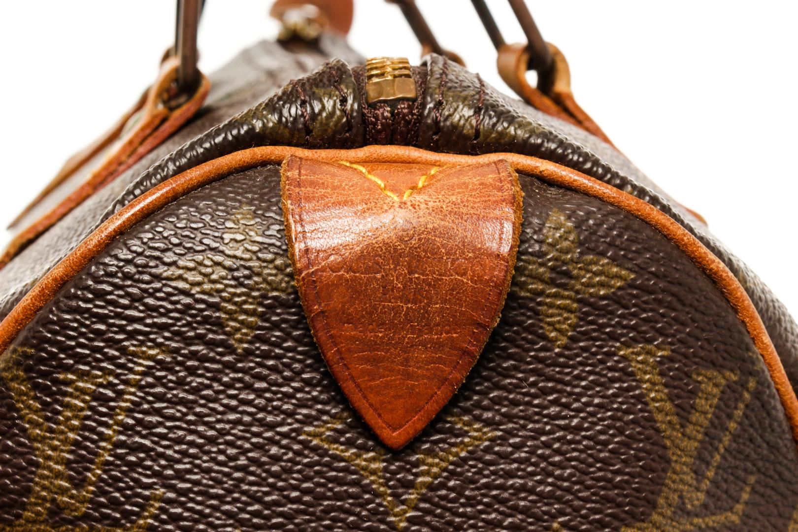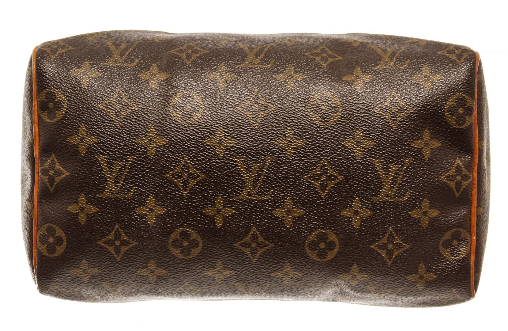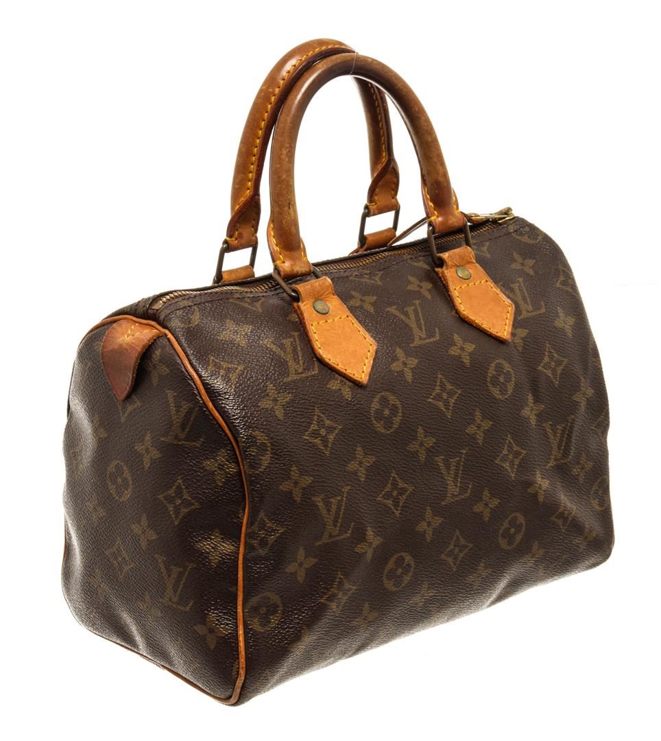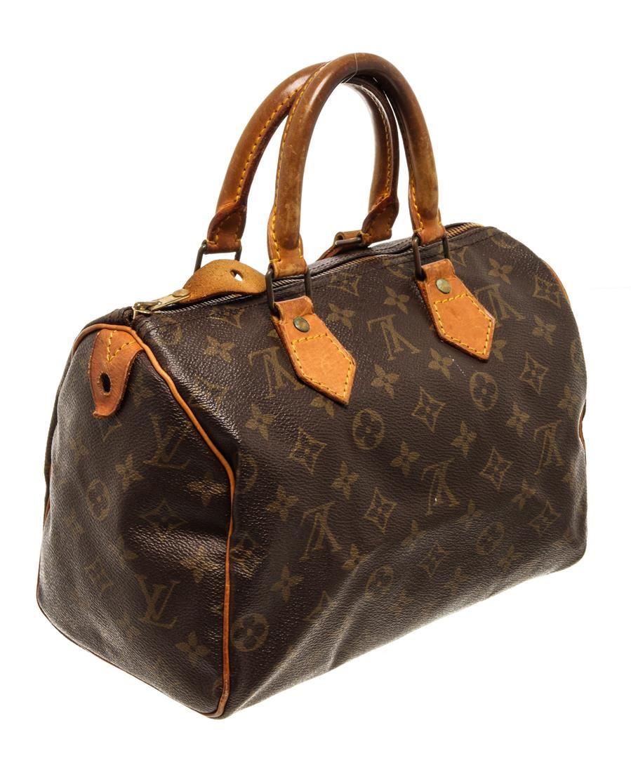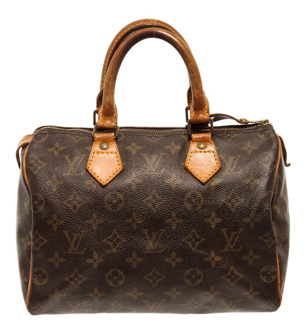 One Louis Vuitton Speedy 25 cm Handbag. Item is sold AS-IS. All available information is listed in the description and shown in the photo. Louis Vuitton Speedy 25 cm handbag with monogram coated canvas exterior, vanchetta leather top handles, brown fabric interior, one interior slip pocket, top zip closure, and gold-tone hardware.