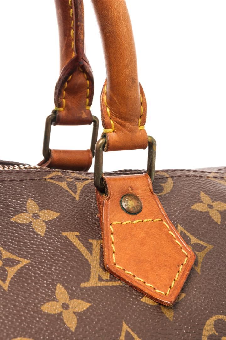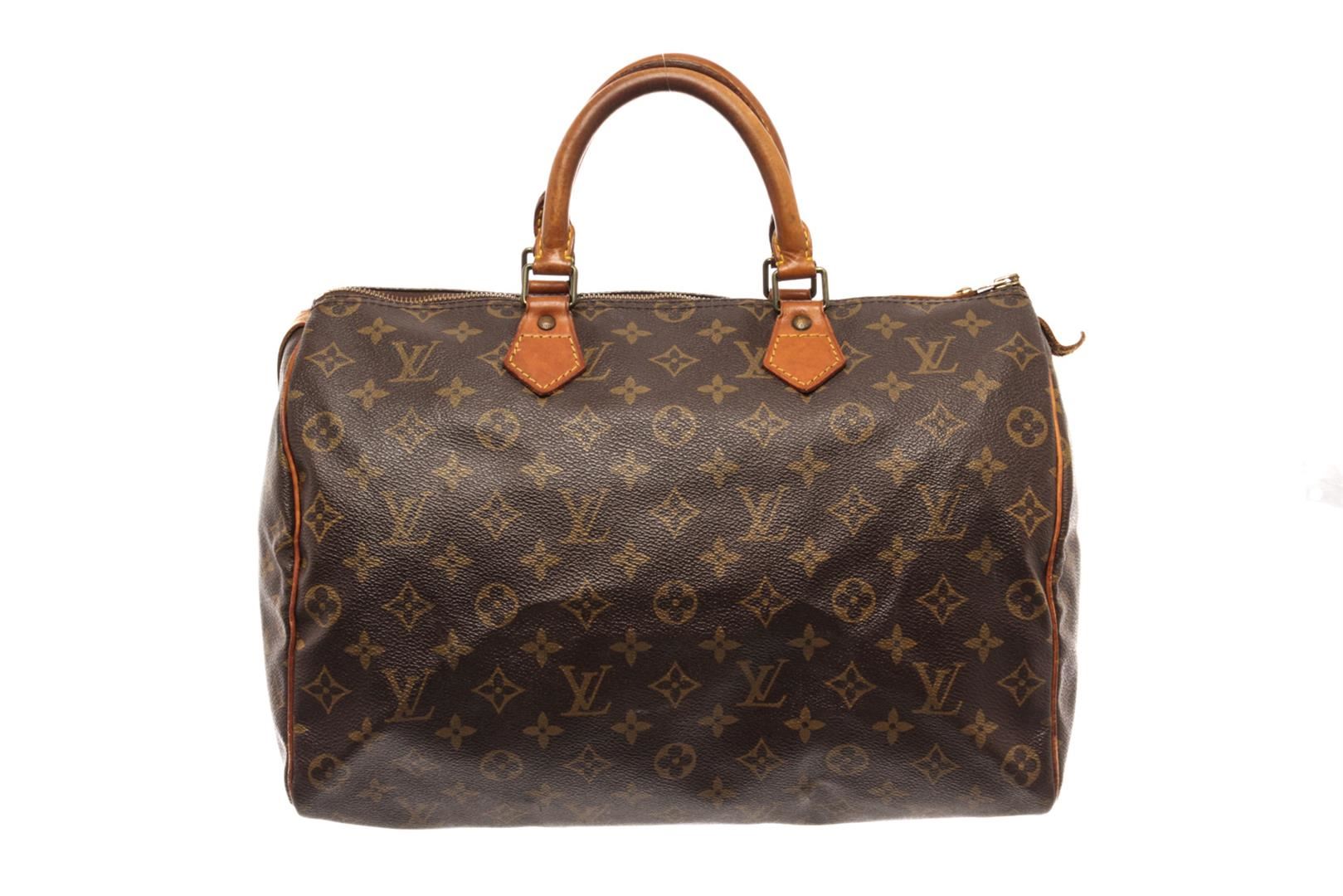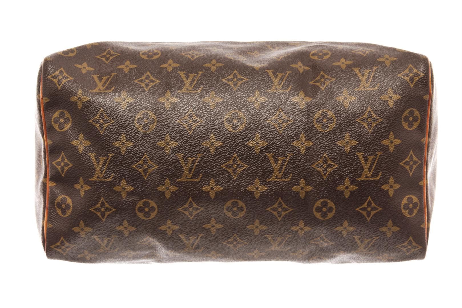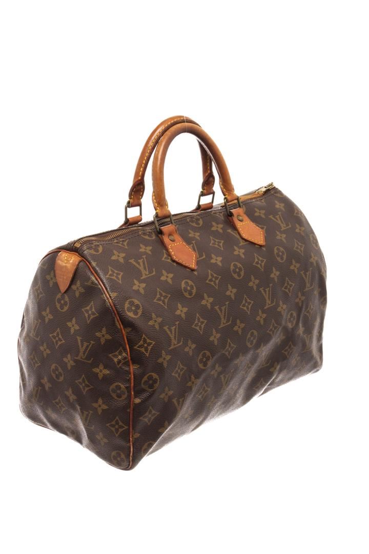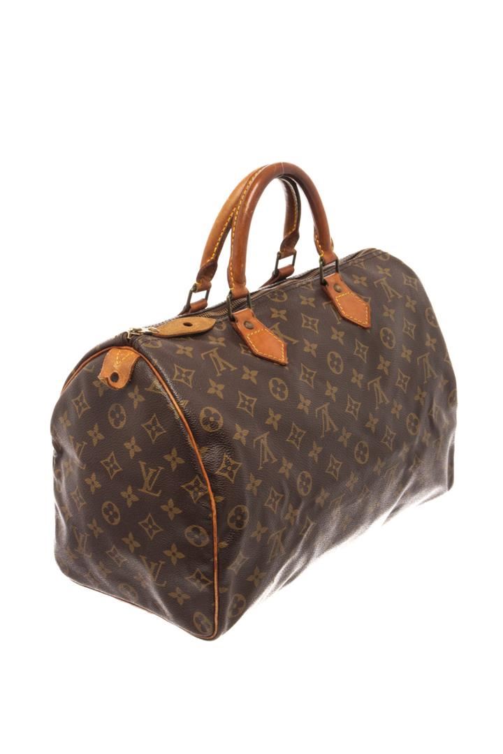 Louis Vuitton Speedy 35 Boston Bag. Brand: Louis Vuitton, Style: Speedy 35, Type: Boston Bag, Exterior color: Brown Monogram, Exterior material: Coated Canvas, Interior color: Brown, Interior material: Canvas, Length: 13, Width: 7.75, Height: 9. Item is s