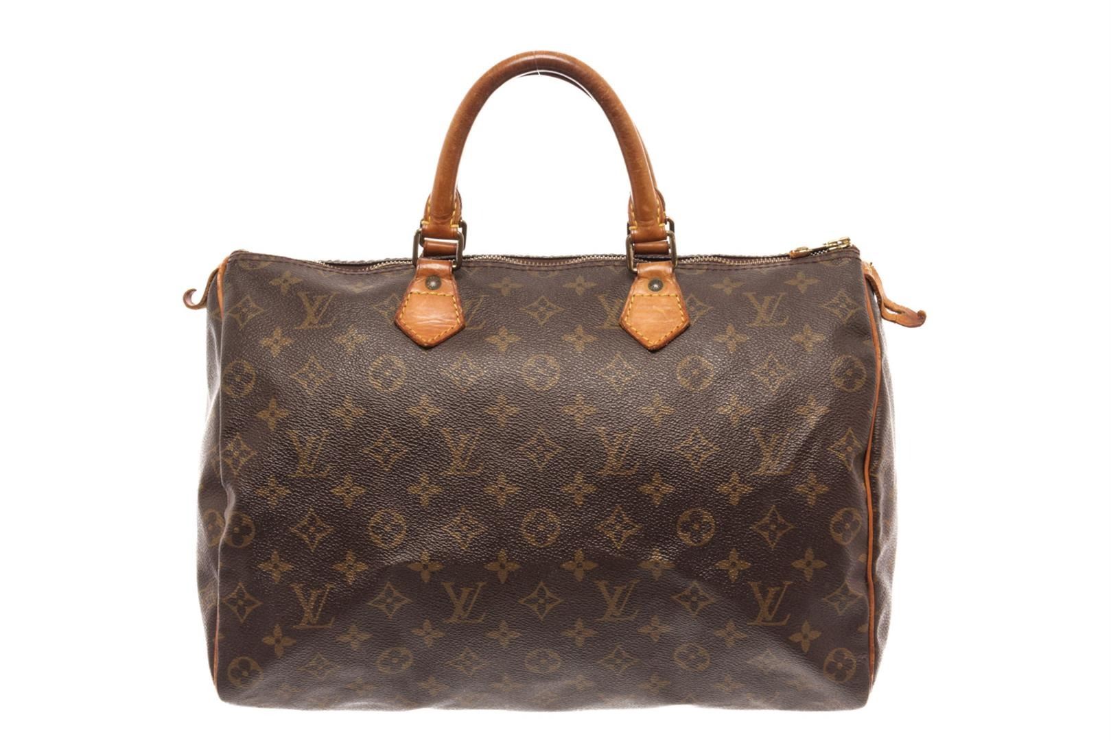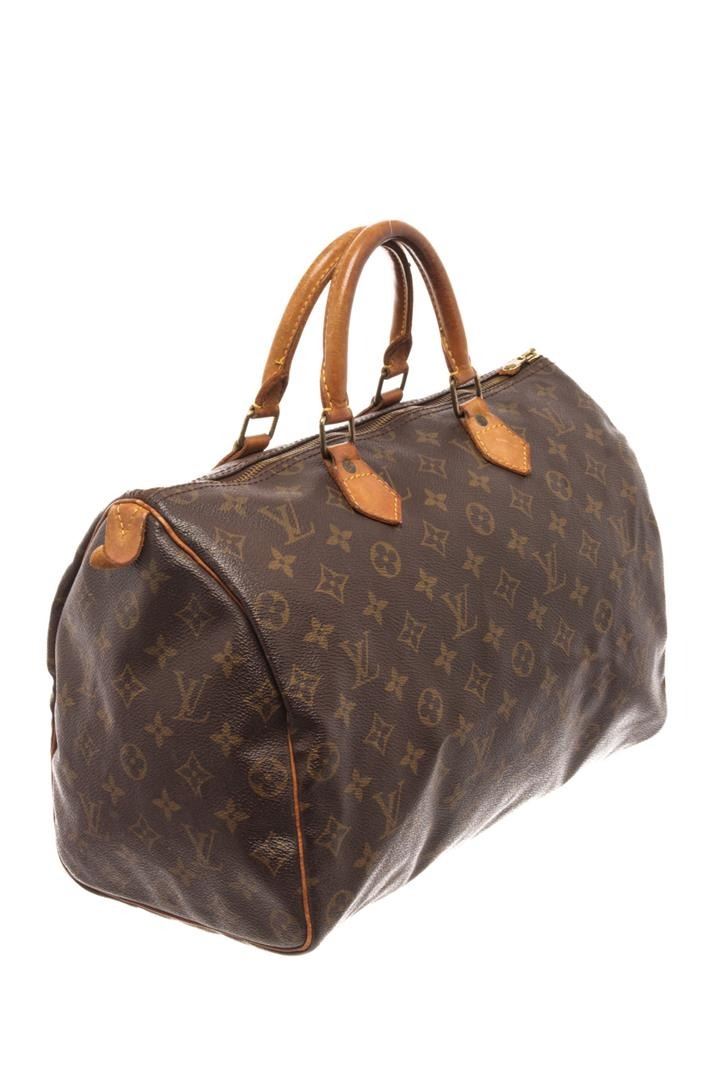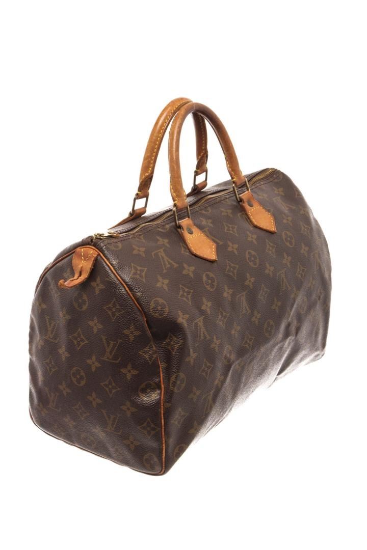 Louis Vuitton Speedy 35 Boston Bag. Brand: Louis Vuitton, Style: Speedy 35, Type: Boston Bag, Exterior color: Brown Monogram, Exterior material: Coated Canvas, Interior color: Brown, Interior material: Canvas, Length: 7.25, Width: 13.75, Height: 9.5. Item