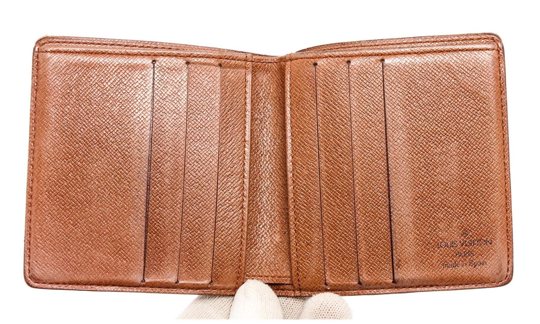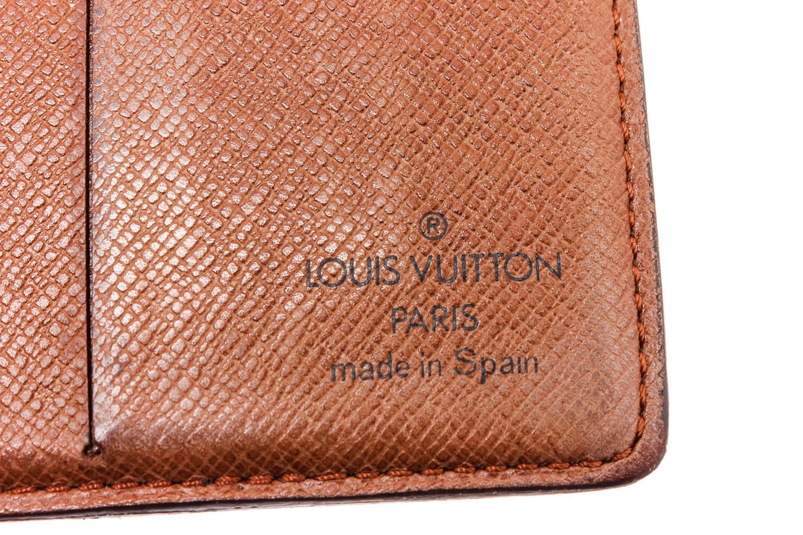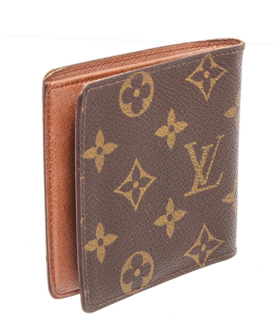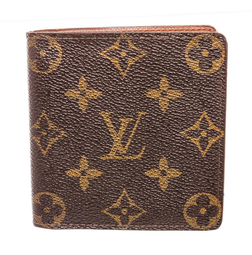 Brown and tan coated canvas Monogram Louis Vuitton Vintage wallet with light brown leather interior, single bill compartment, dual slip pockets, six card slots and bifold closure.
