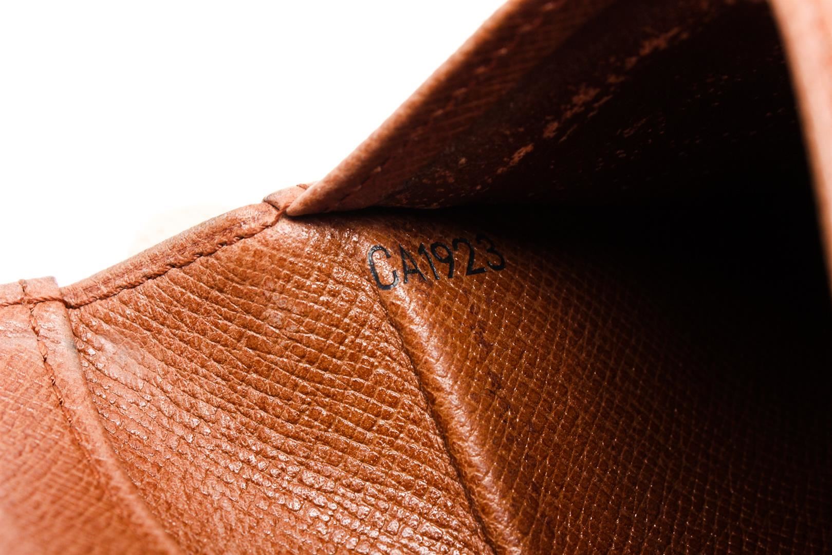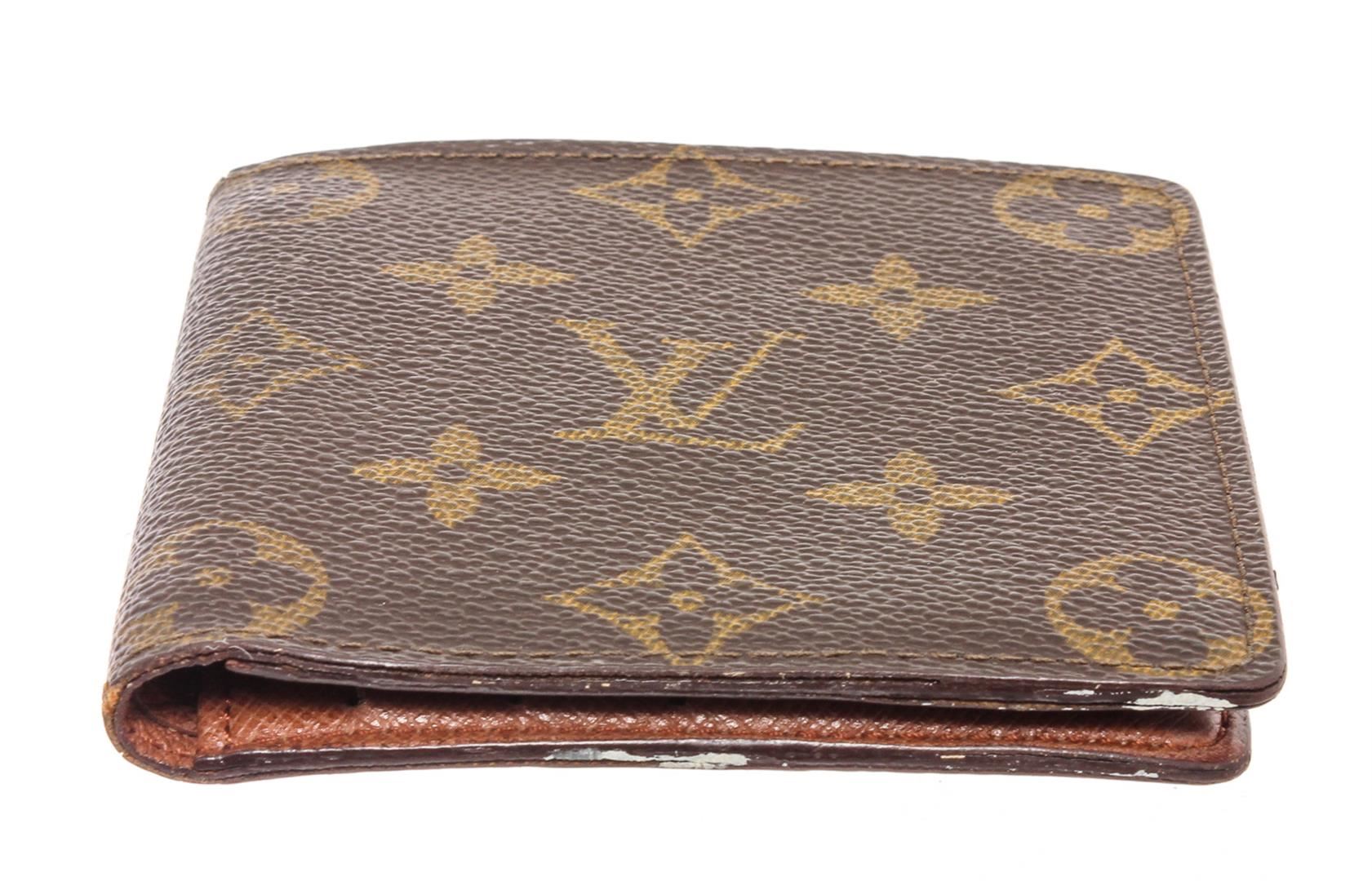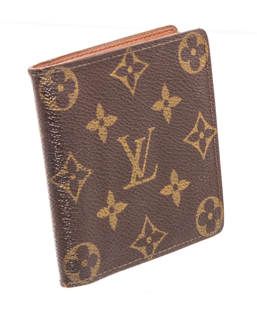 Brown and tan coated canvas Monogram Louis Vuitton Vintage wallet with light brown leather interior, single bill compartment, dual slip pockets, six card slots and bifold closure.