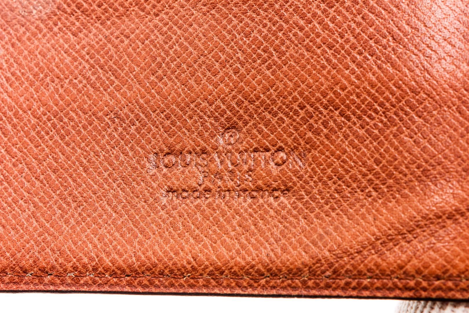 Vintage brown and tan monogram coated canvas Louis Vuitton vintage checkbook holder wallet with brown textured leather lining, three bill compartments and six card slots.