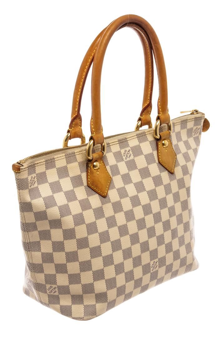 Louis Vuitton White Damier Azur Saleya PM Shoulder Bag. All available information is listed in the description and shown in the photos. Louis Vuitton White Damier Azur Saleya PM Shoulder Bag with leather trim, two top handles, top zip fastening, main compartment, internal slip pocket, gold-tone hardware. Depth 5.3 in, Handle 5.5 in, Height 9.1 in, Width 13.8 in / 13.46 x 23.11 x 35.05 CM, Handle: 13.97 CM