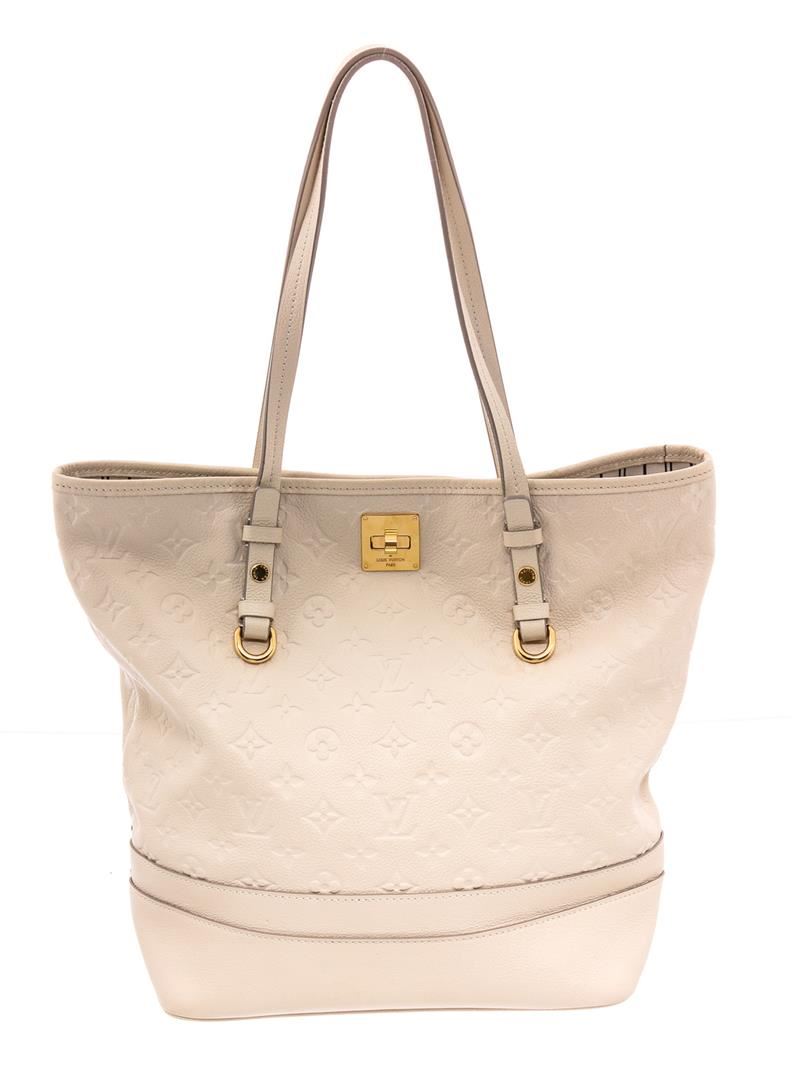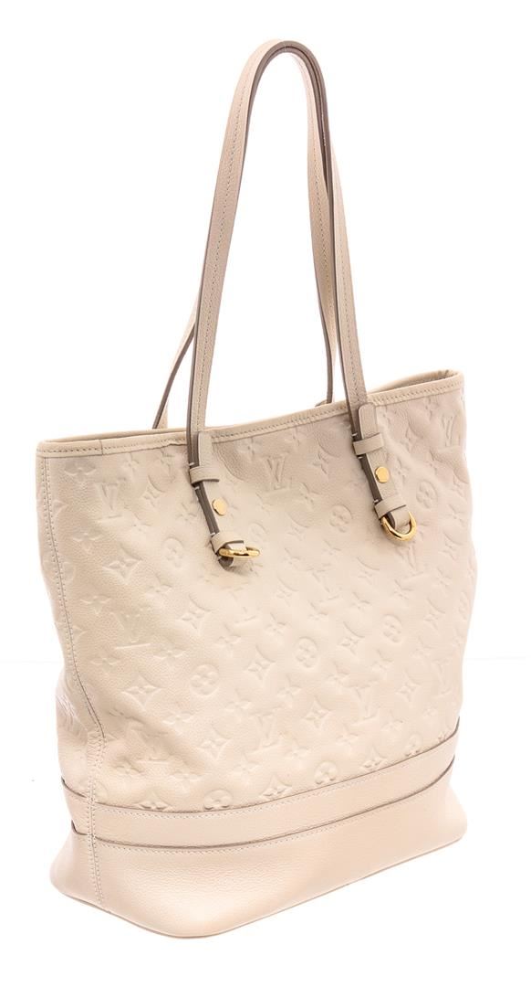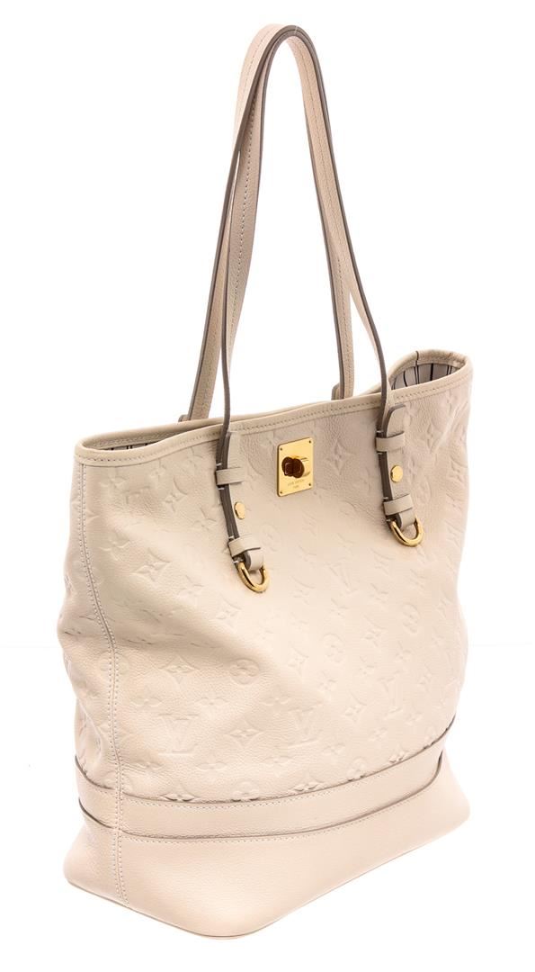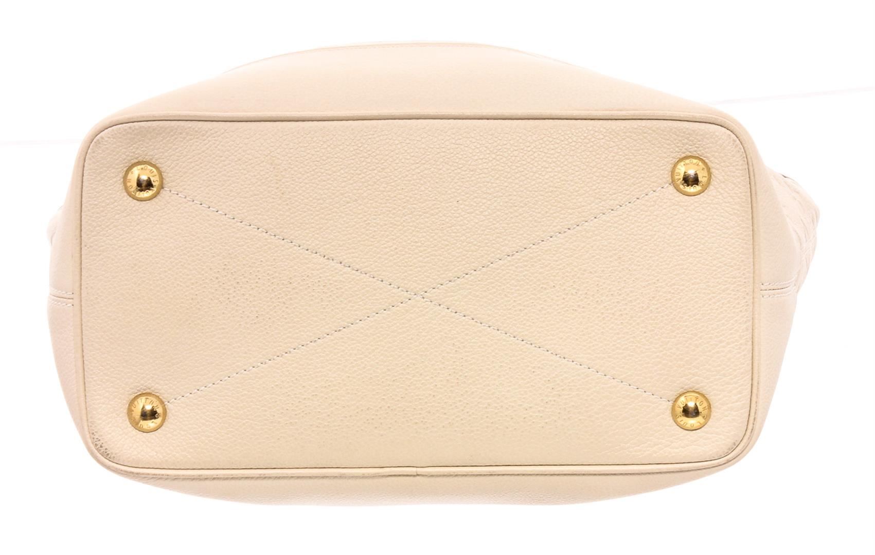 White Empreinte leather Louis Vuitton Citadine PM with brass hardware, dual flat shoulder straps, protective feet at base, tonal and black stripe canvas lining, three pockets at interior wall; one with zip closure and turn-lock closure at front.
