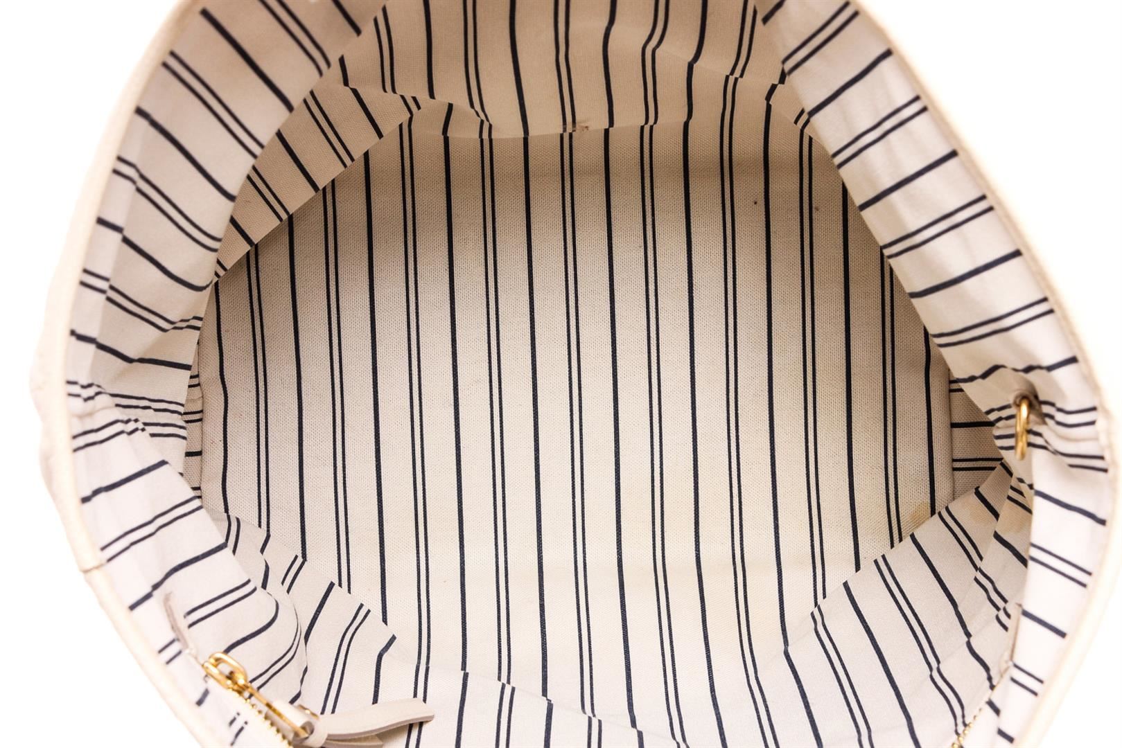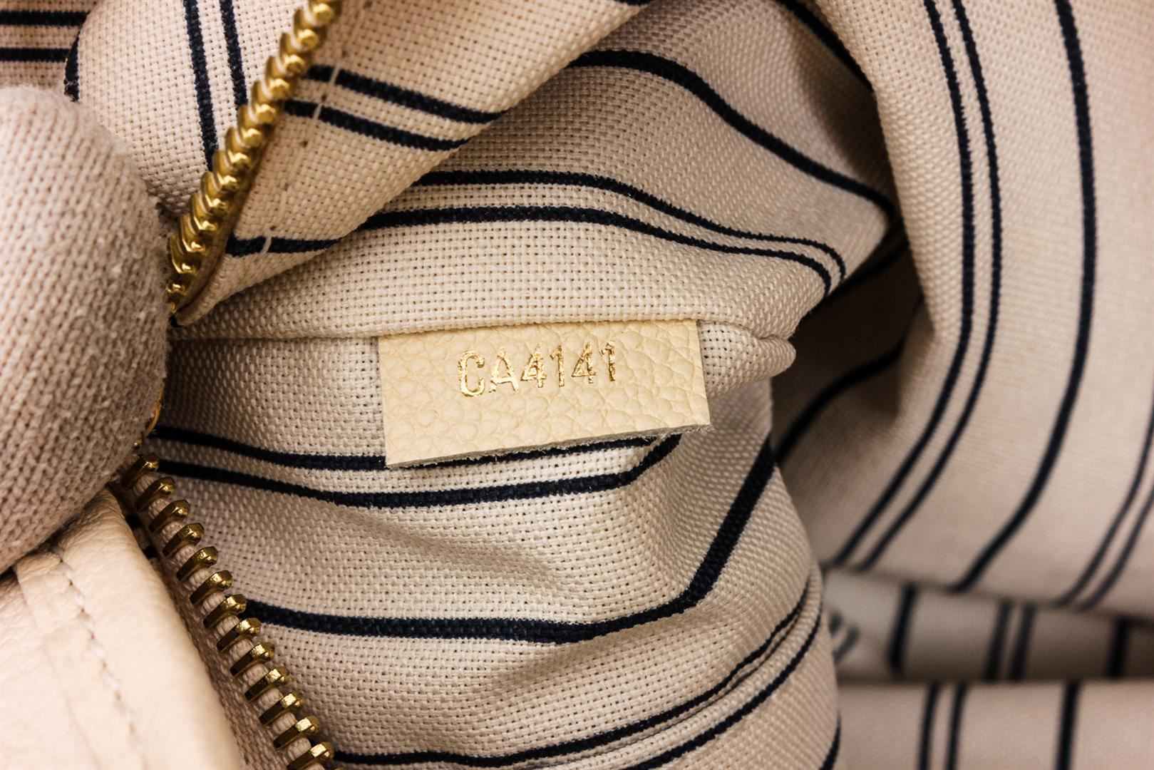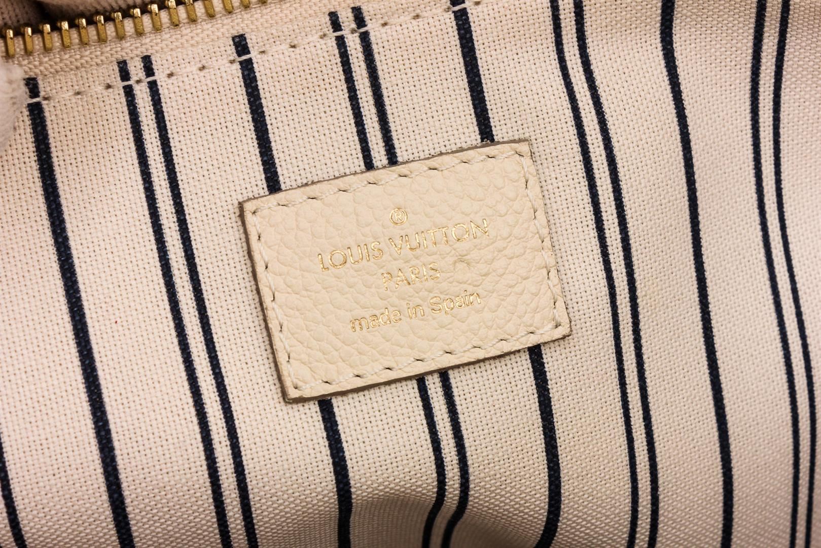White Empreinte leather Louis Vuitton Citadine PM with brass hardware, dual flat shoulder straps, protective feet at base, tonal and black stripe canvas lining, three pockets at interior wall; one with zip closure and turn-lock closure at front.