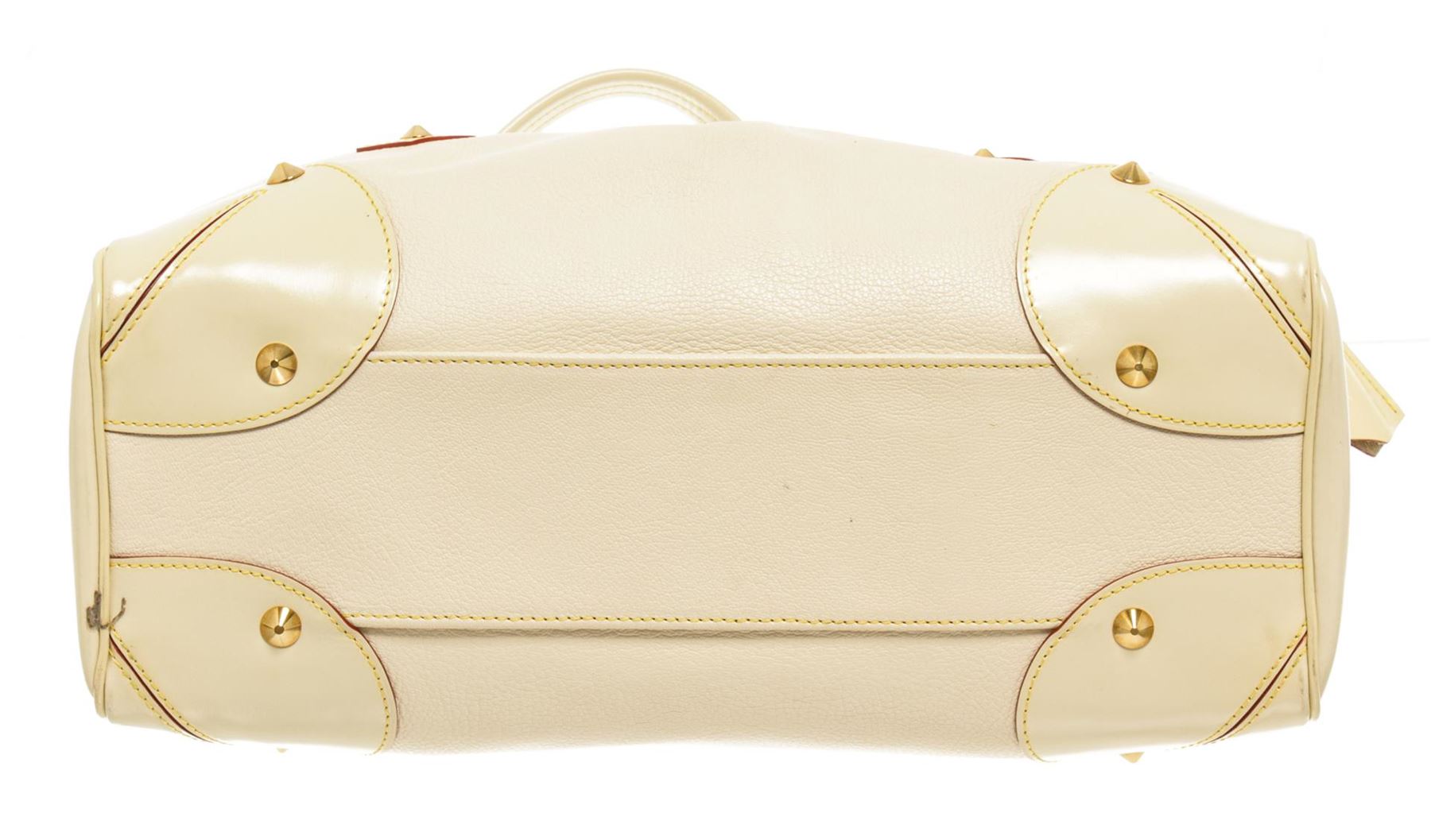 One Louis Vuitton White Leather Le Absolu Handbag. Item is sold AS-IS. All available information is listed in the description and shown in the photo. Louis Vuitton White Leather Le Absolu Handbag with top handle, fabric lining, gold tone hardware, snap closure.