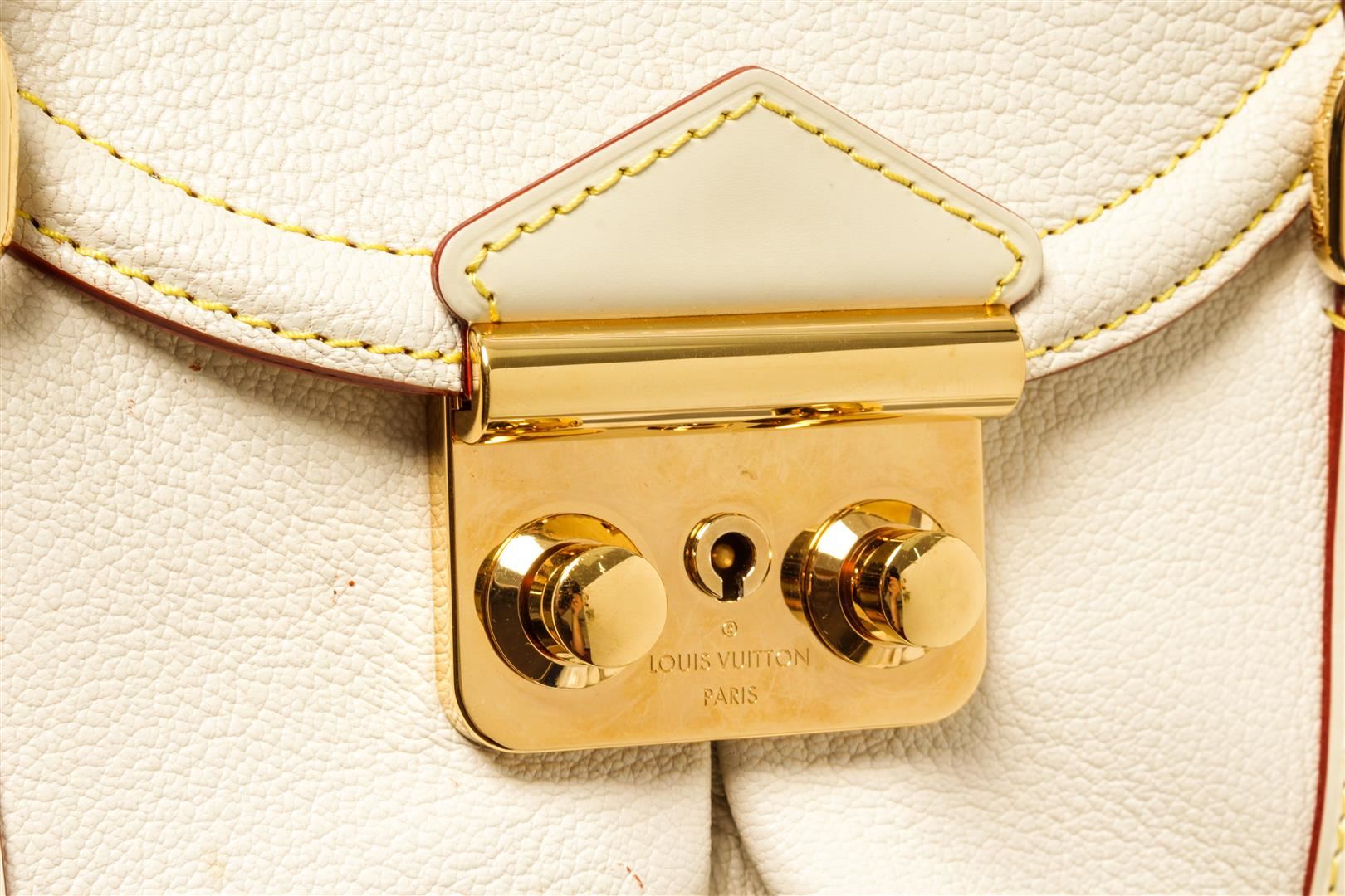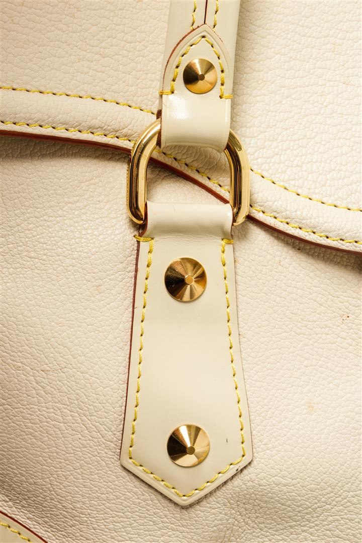 One Louis Vuitton White Leather Le Absolu Handbag. Item is sold AS-IS. All available information is listed in the description and shown in the photo. Louis Vuitton White Leather Le Absolu Handbag with top handle, fabric lining, gold tone hardware, snap closure.