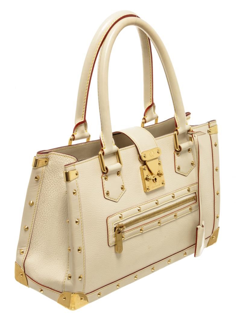 One Louis Vuitton White Leather Le Fabuleux Shoulder Bag. Item is sold AS-IS. All available information is listed in the description and shown in the photo. Louis Vuitton White Leather Le Fabuleux Shoulder Bag with top handle, exterior zipper pocket, fabric lining, zipper interior pocket, snap closure.