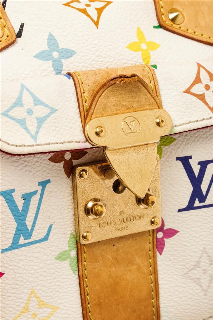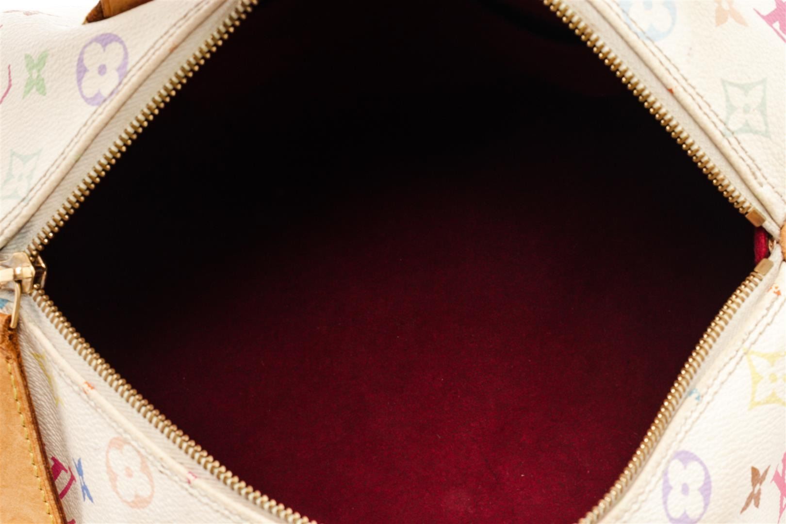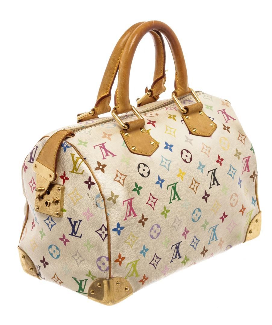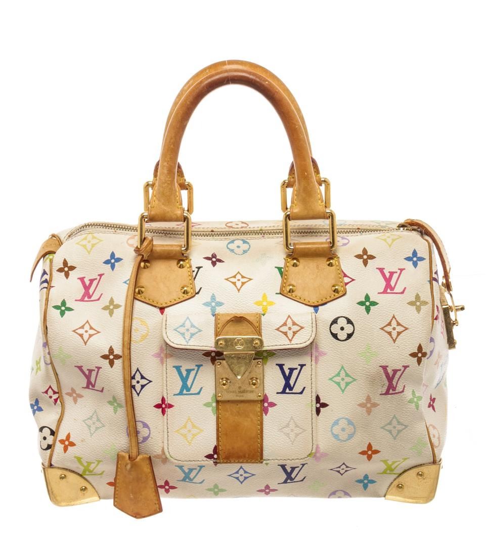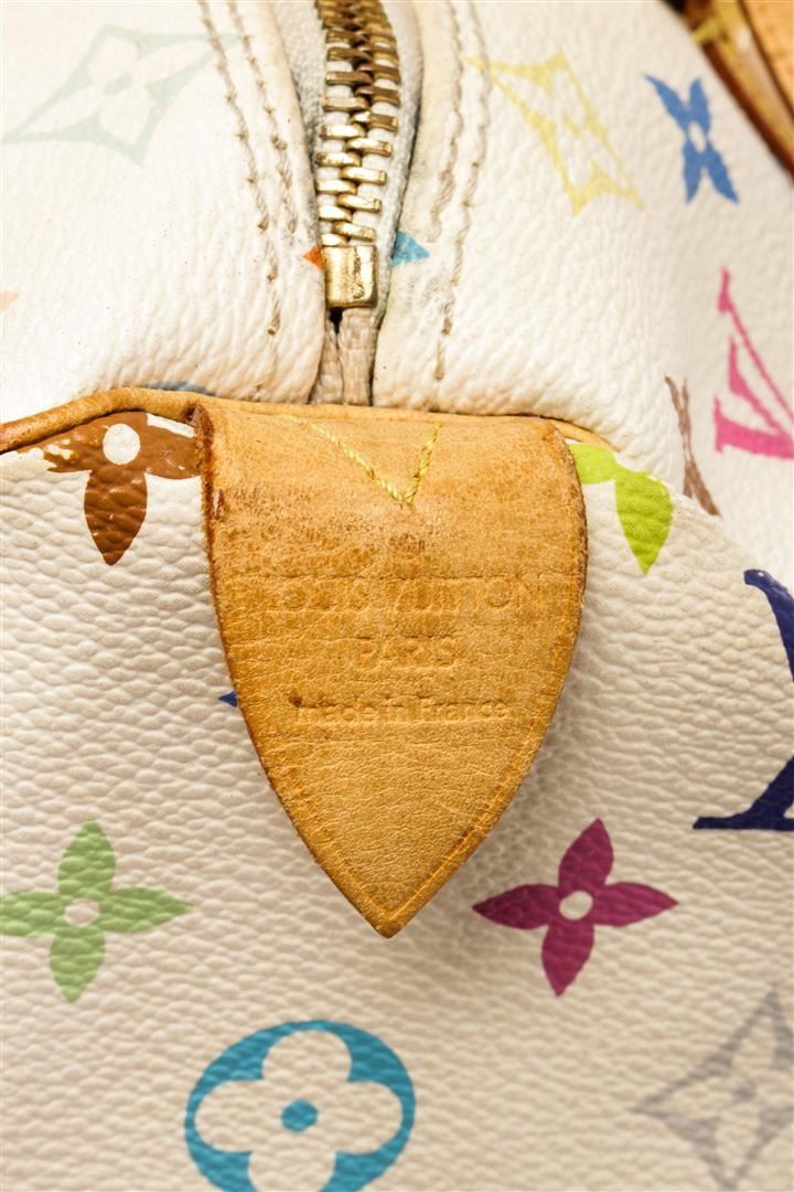 Louis Vuitton White Multicolor Monogram Leather Speedy 30 Satchel Bag. All available information is listed in the description and shown in the photos. Louis Vuitton White Multicolor Monogram Leather Speedy 30 Satchel Bag with dual-rolled vachetta handles, a front flap pocket with s-lock closure, leather clochette, metal framed edges, and gold-tone hardware accents. its top zip closure opens to a red microfiber-lined interior with slip pockets perfect to hold your daily essentials. Height: 8" Width: 12" Depth: 7", Drop 4" / 20.32 x 30.48 x 17.78 cm