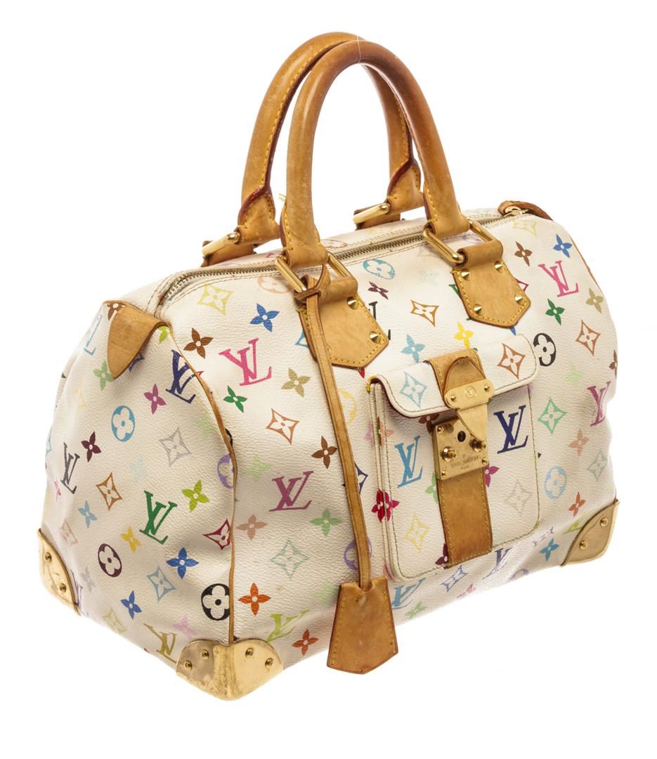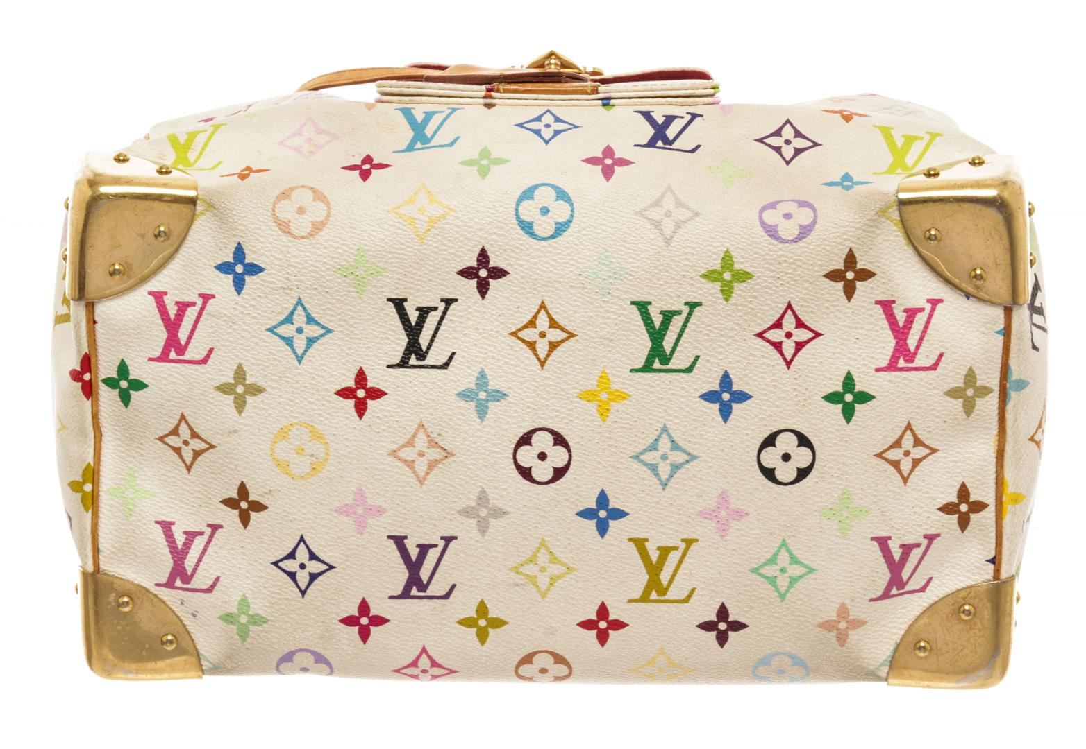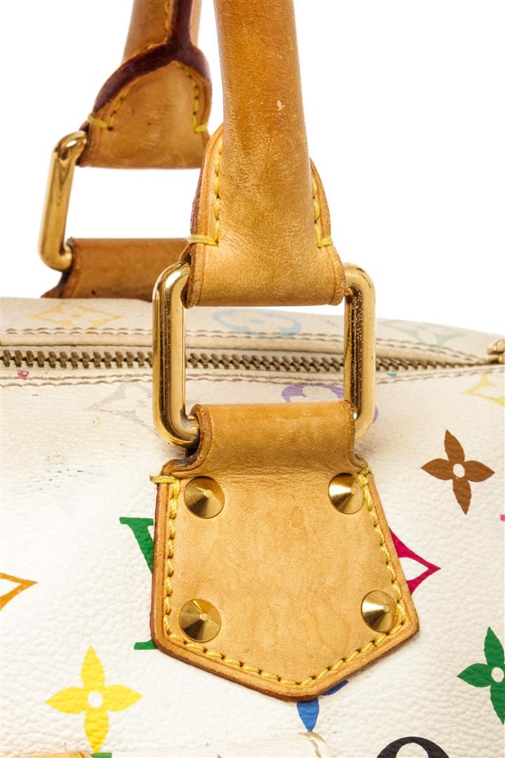 Louis Vuitton White Multicolor Monogram Leather Speedy 30 Satchel Bag. All available information is listed in the description and shown in the photos. Louis Vuitton White Multicolor Monogram Leather Speedy 30 Satchel Bag with dual-rolled vachetta handles, a front flap pocket with s-lock closure, leather clochette, metal framed edges, and gold-tone hardware accents. its top zip closure opens to a red microfiber-lined interior with slip pockets perfect to hold your daily essentials. Height: 8" Width: 12" Depth: 7", Drop 4" / 20.32 x 30.48 x 17.78 cm