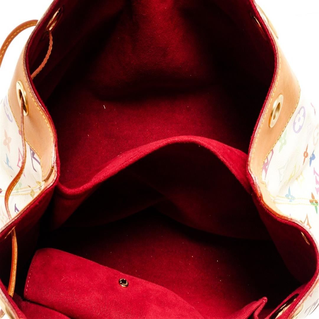One Louis Vuitton White Multicolor Monogram Ursula Bag. Item is sold AS-IS. All available information is listed in the description and shown in the photo. Louis Vuitton white multicolor monogram Ursula bag with gold-tone hardware, dual chain-link shoulder straps with shoulder guards, tan vachetta leather trim, drawstring accents at sides, yellow contrast stitching, red Alcantara lining, dual interior compartments, dual pockets at interior wall; one with flap snap closure and push-lock closure at front. Stains on the exterior leather, vachetta stain please refer to photos. Height: 9.75" Width: 6.25" Depth: 15.75" , Handle Drop: / 24.77 x 15.88 x 40.01 Cm