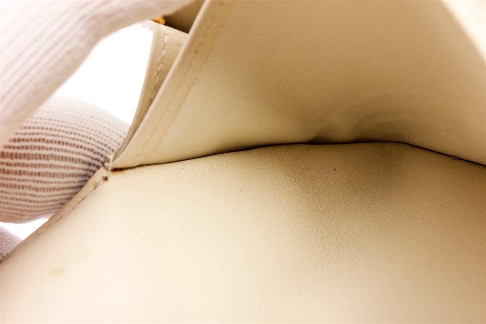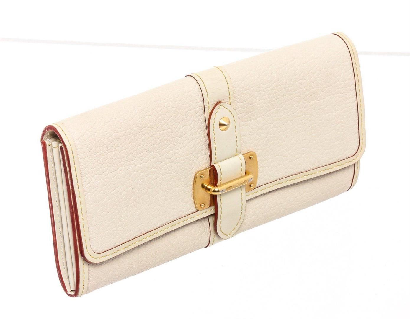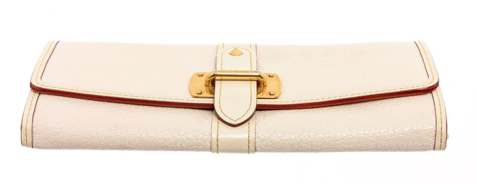 White Suhali leather Louis Vuitton Le Favori wallet with brass hardware, zip pocket at back, six card slots at flap underside, creme contrast stitching throughout, tonal leather lining, three interior compartments; one with zip closure, dual bill compartments at interior walls, eight card slots and snap closure at front flap featuring logo accent.