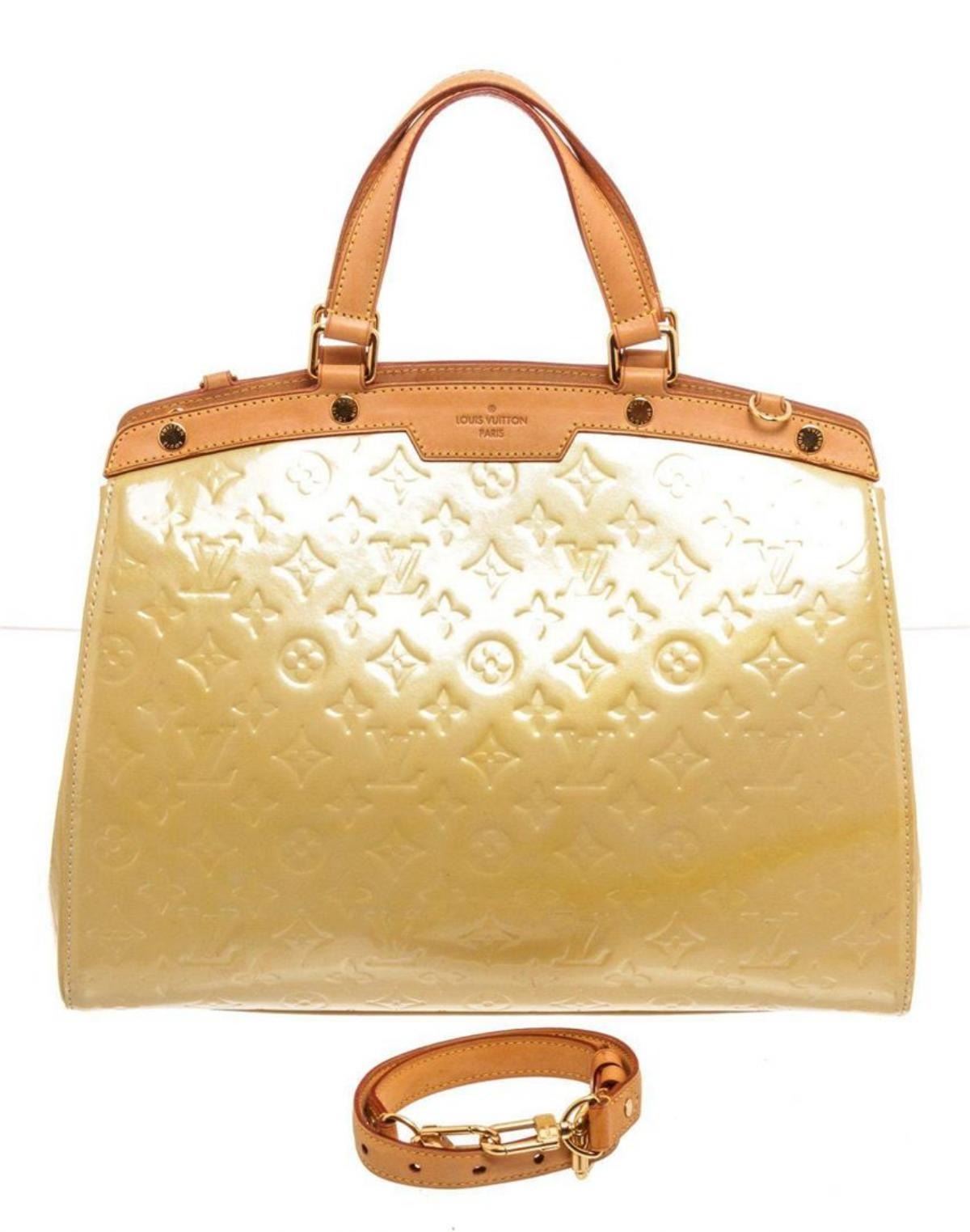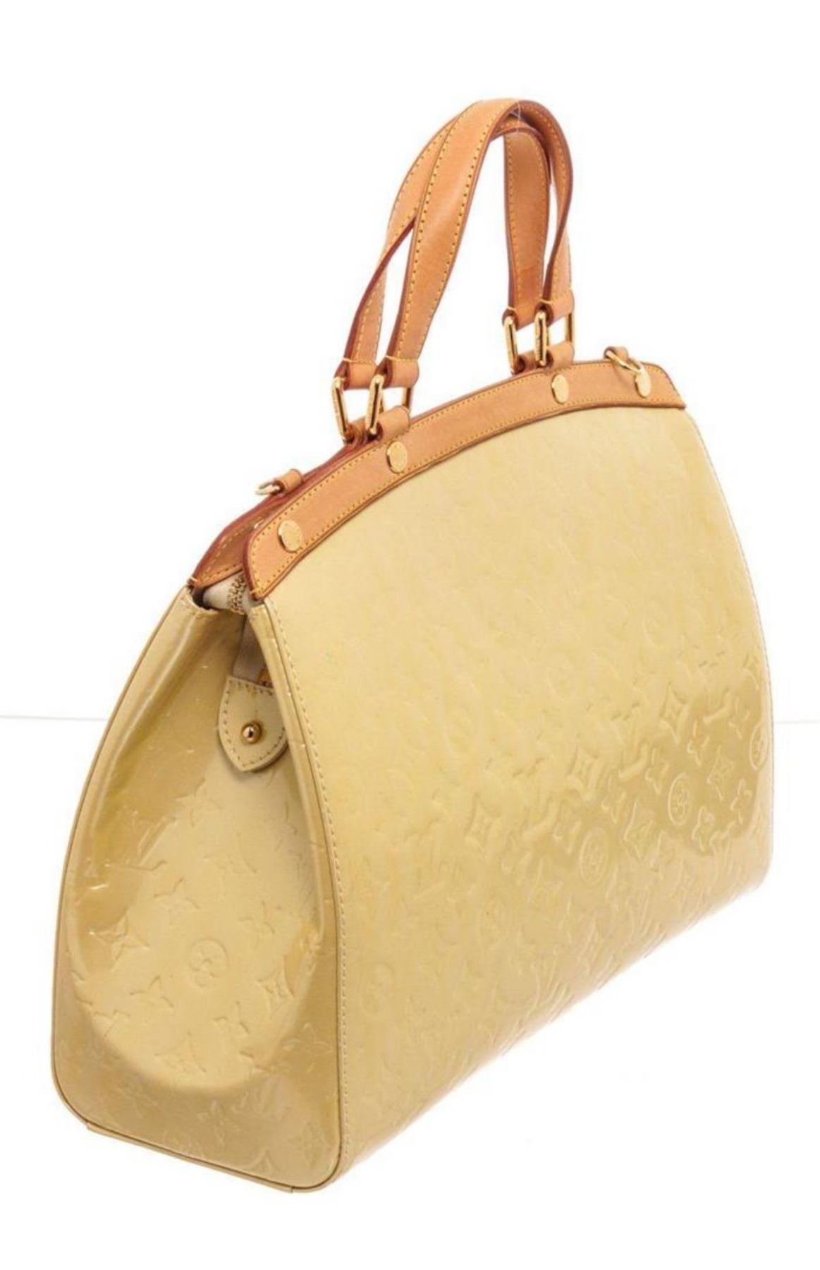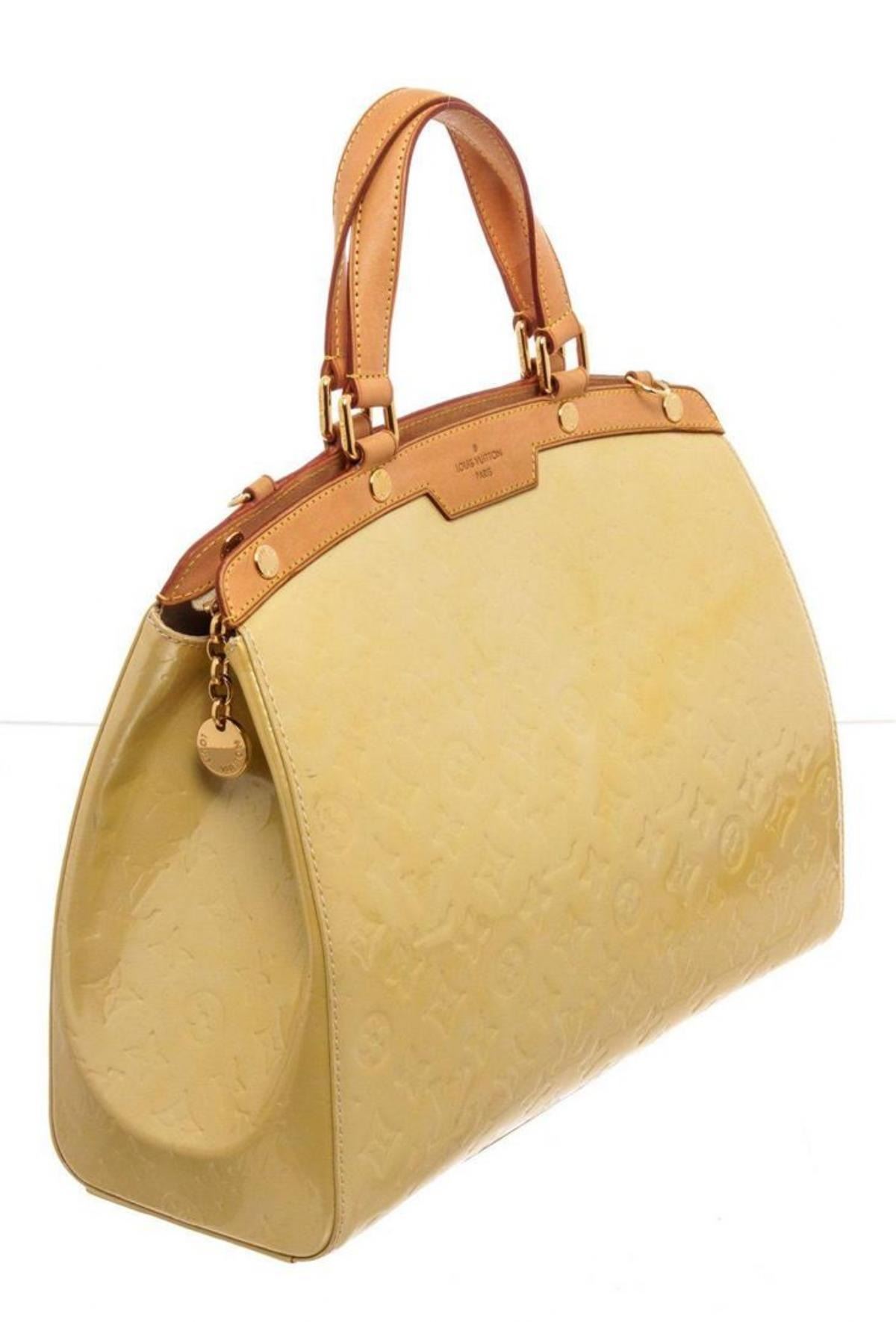 Louis Vuitton Yellow Brea GM Shoulder Bag with material vernis leather, gold-tone hardware, trim tan vachetta leather, interior three compartments pocket, dual top handle, shoulder strap and zip closure.