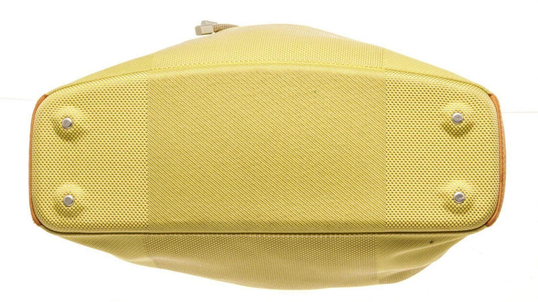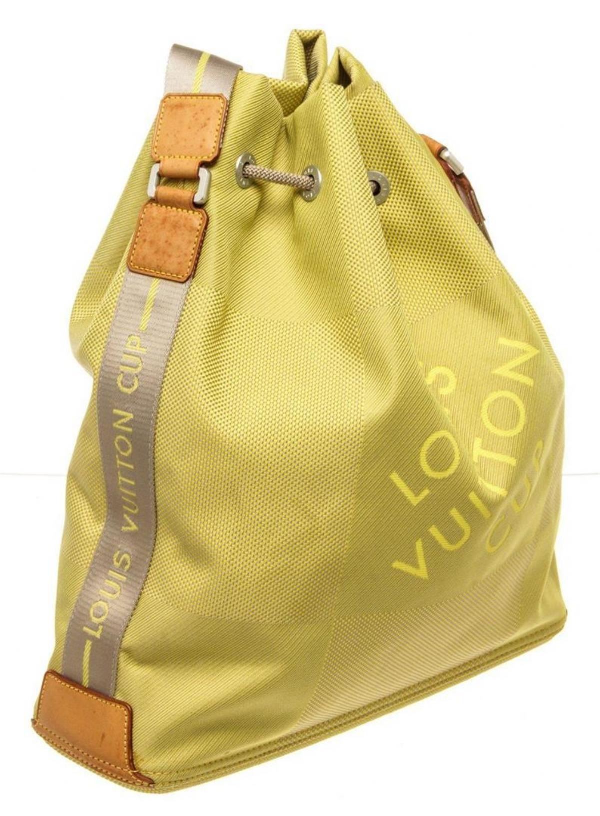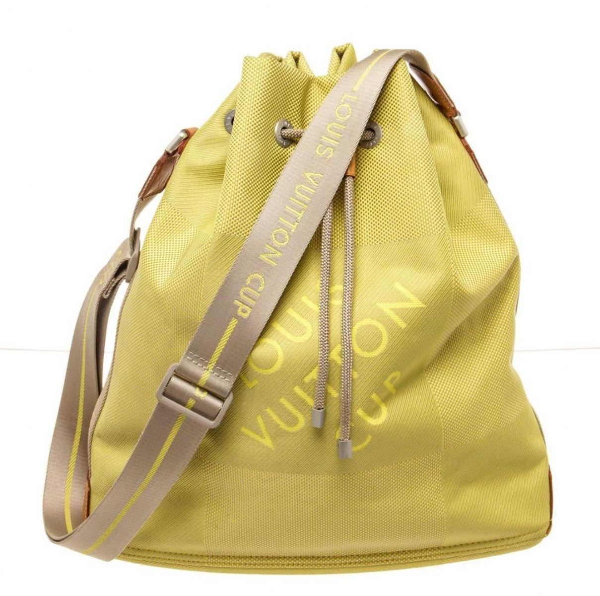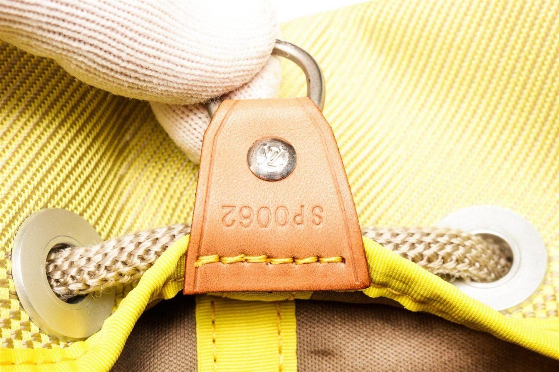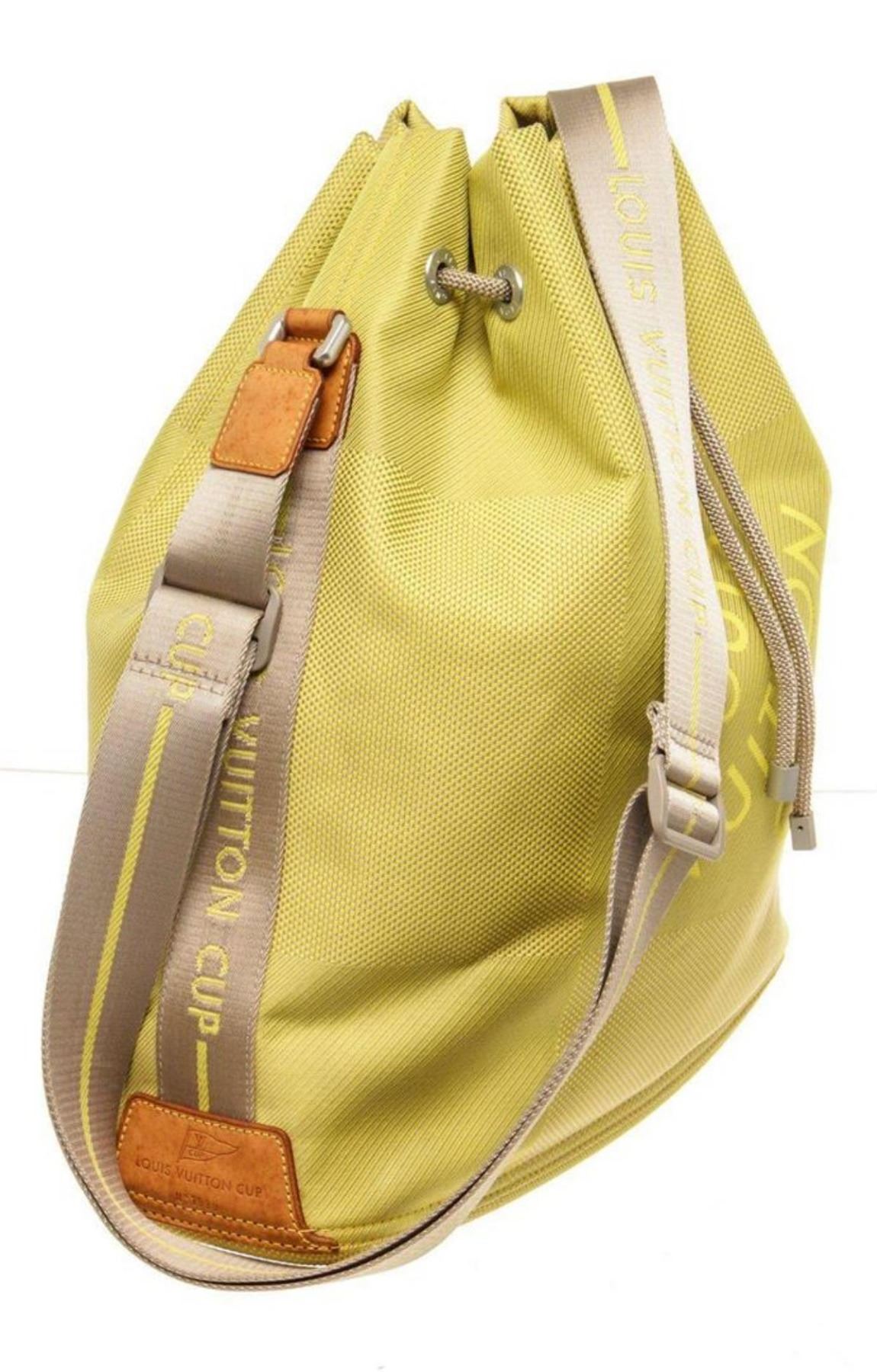 Louis Vuitton Yellow Canvas Jean Weatherly Shoulder Bag with canvas, gold-tone hardware, trim tan vachetta leather, interior slip pockets, shoulder strap and drawstring closure.