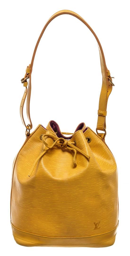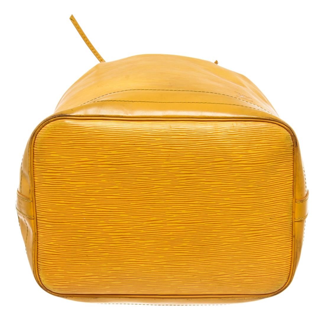 One Louis Vuitton Yellow Epi Leather Noe Bucket Bag. Item is sold AS-IS. All available information is listed in the description and shown in the photo. Louis Vuitton Yellow Epi Leather Noe Bag with gold-tone hardware, yellow leather trim, purple suede lining, single adjustable leather shoulder strap, and drawstring closure. .