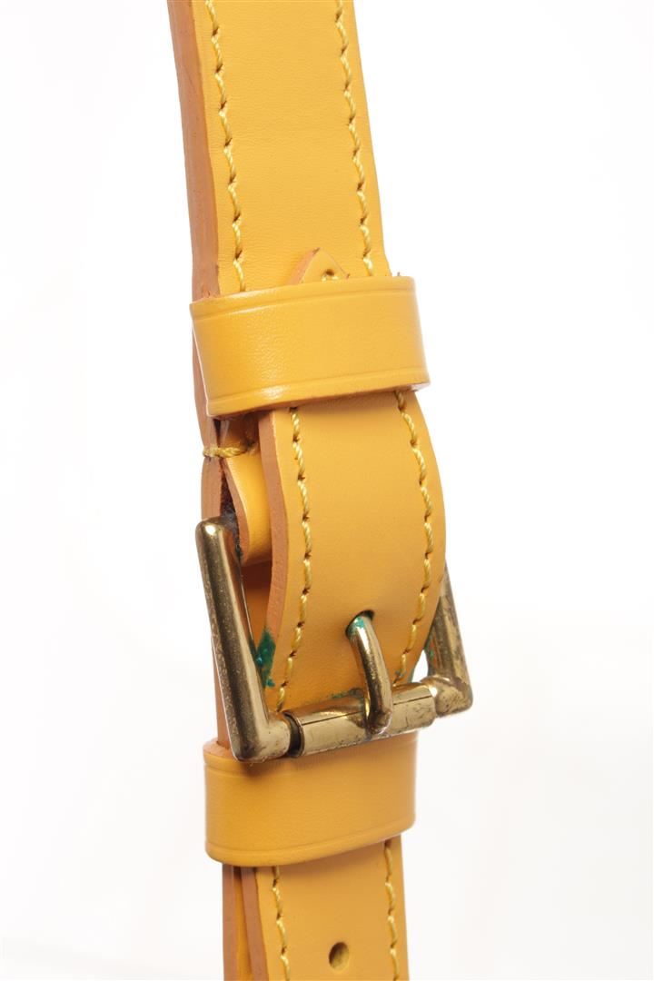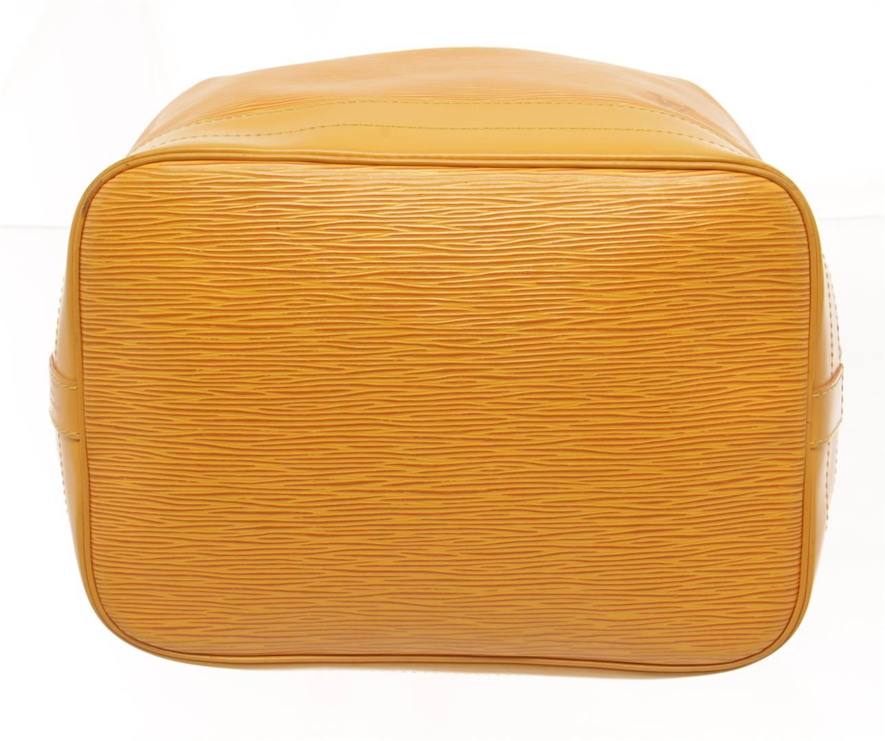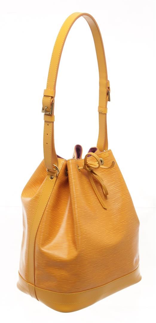 One Louis Vuitton Yellow Epi Leather Noe GM Shoulder Bag. Item is sold AS-IS. All available information is listed in the description and shown in the photo. louis vuitton yellow epi leather noe gm shoulder bag with yellow epi leather, with brass hardware, adjustable flat shoulder strap, drawstring closure at front face opening to violet alcantara lined interior. 13"h, 16"w, 17.5"d / 33.02 x 40.64 x 44.45 cm