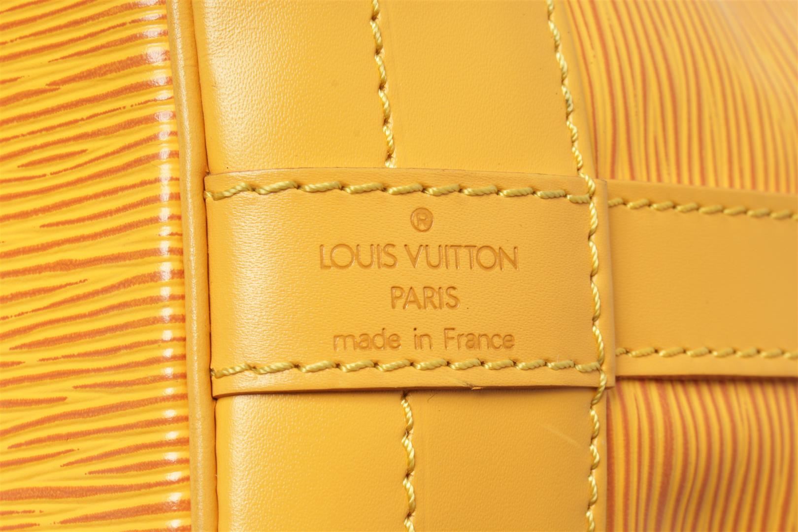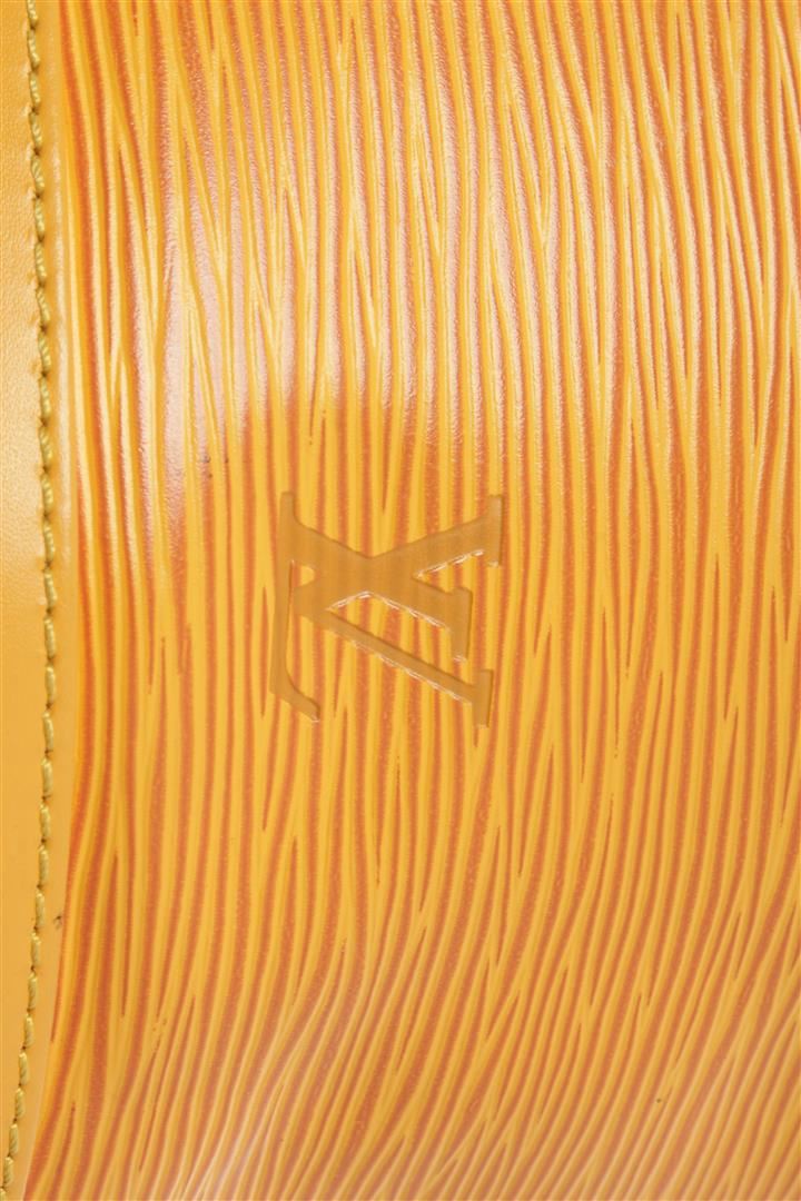 One Louis Vuitton Yellow Epi Leather Noe GM Shoulder Bag. Item is sold AS-IS. All available information is listed in the description and shown in the photo. louis vuitton yellow epi leather noe gm shoulder bag with yellow epi leather, with brass hardware, adjustable flat shoulder strap, drawstring closure at front face opening to violet alcantara lined interior. 13"h, 16"w, 17.5"d / 33.02 x 40.64 x 44.45 cm