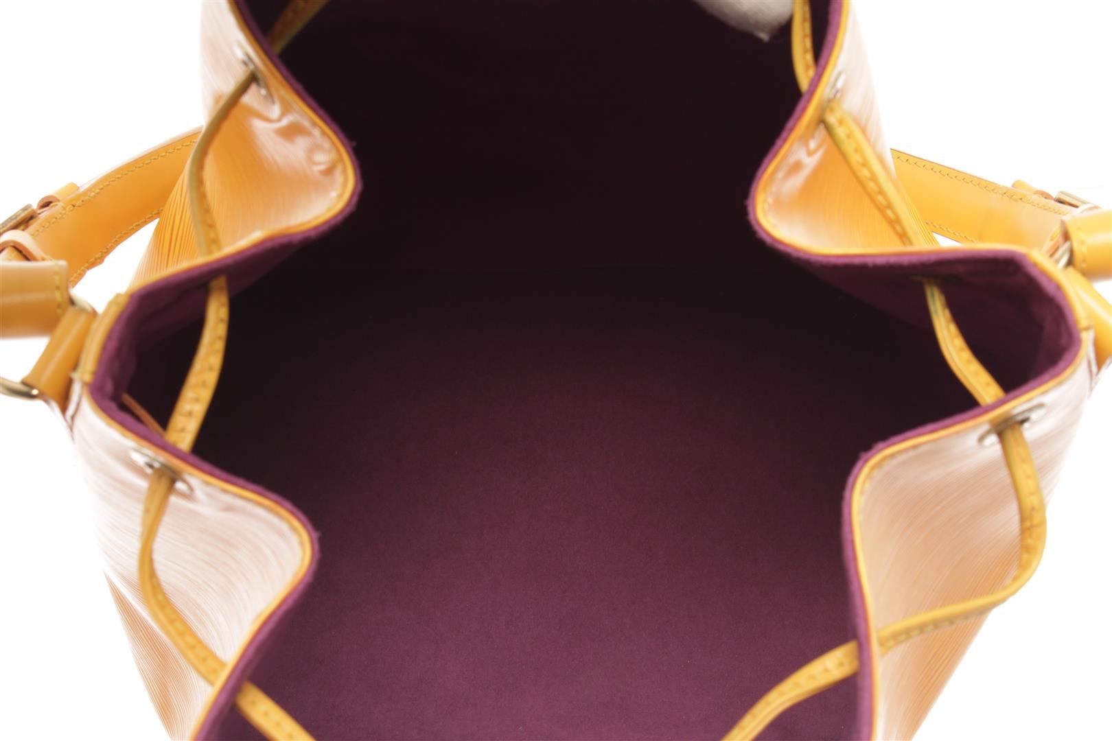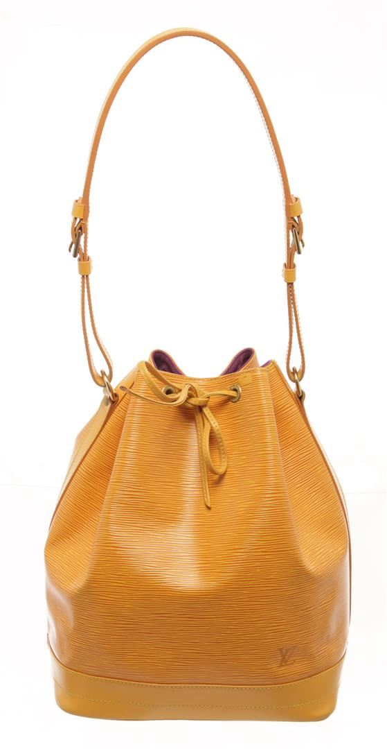 One Louis Vuitton Yellow Epi Leather Noe GM Shoulder Bag. Item is sold AS-IS. All available information is listed in the description and shown in the photo. louis vuitton yellow epi leather noe gm shoulder bag with yellow epi leather, with brass hardware, adjustable flat shoulder strap, drawstring closure at front face opening to violet alcantara lined interior. 13"h, 16"w, 17.5"d / 33.02 x 40.64 x 44.45 cm