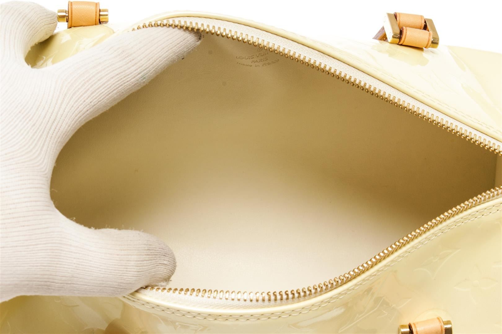 One Louis Vuitton Yellow Monogram Vernis Bedford Handbag. Item is sold AS-IS. All available information is listed in the description and shown in the photo. Louis Vuitton Yellow Monogram Vernis Bedford Handbag with vernis leather, gold-tone hardware, trim tan vachetta leather, leather lining, shoulder strap and zipper closure.