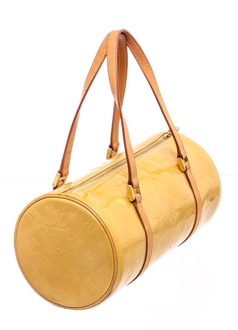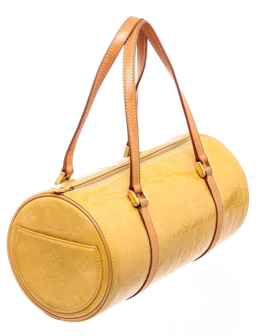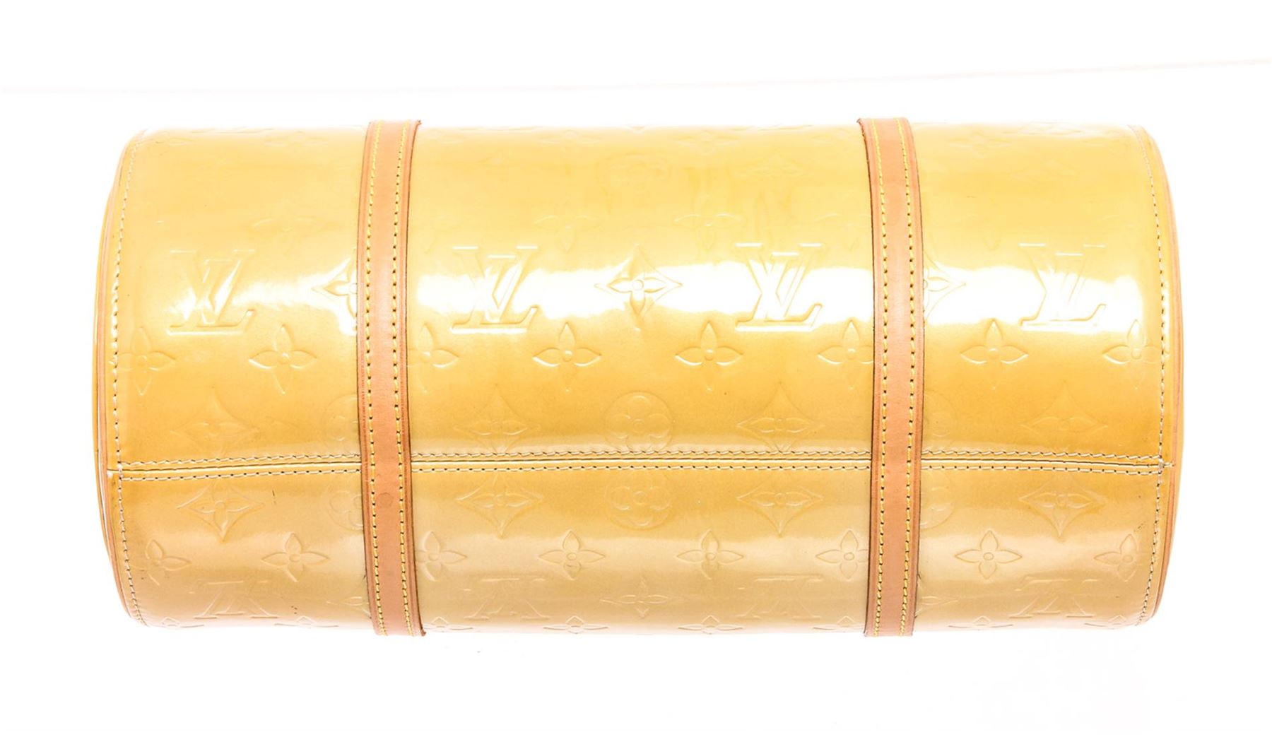 Yellow monogram Vernis leather Louis Vuitton Bedford bag with gold-tone hardware, tan vachetta leather accents, dual flat top handles, exterior pocket at side, beige leather lining and zip closure at top.