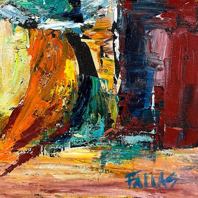"Love Story" is an original oil painting on canvas by Elliot Fallas, hand signed by the artist. This piece comes gallery wrapped. Includes Letter of Authenticity. Measures approx. 18" x 14" (image). The sides of the canvas are painted and it can be hung as is, but a frame is definitely recommended.