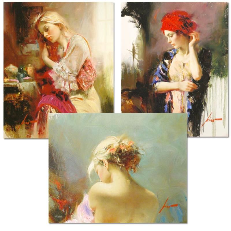 "Harmony" "Love" and "Desire" is a hand embellished 3 piece suite of limited edition giclees on canvas by Pino (1939-2010). Numbered and hand signed. Includes Certificate of Authenticity. Measures approximately 16" x 20" (each piece). This piece is not stretched.