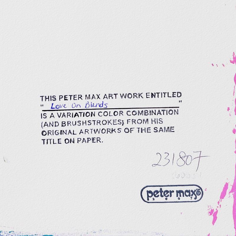 Love is a one-of-a-kind acrylic mixed media on paper, hand signed by Peter Max. The piece comes custom framed with a backside cutout to display Peter Max Studio registration number 231807 certifying authenticity. Measures approximately 24 x 22 (frame), 10 x 8 (image).