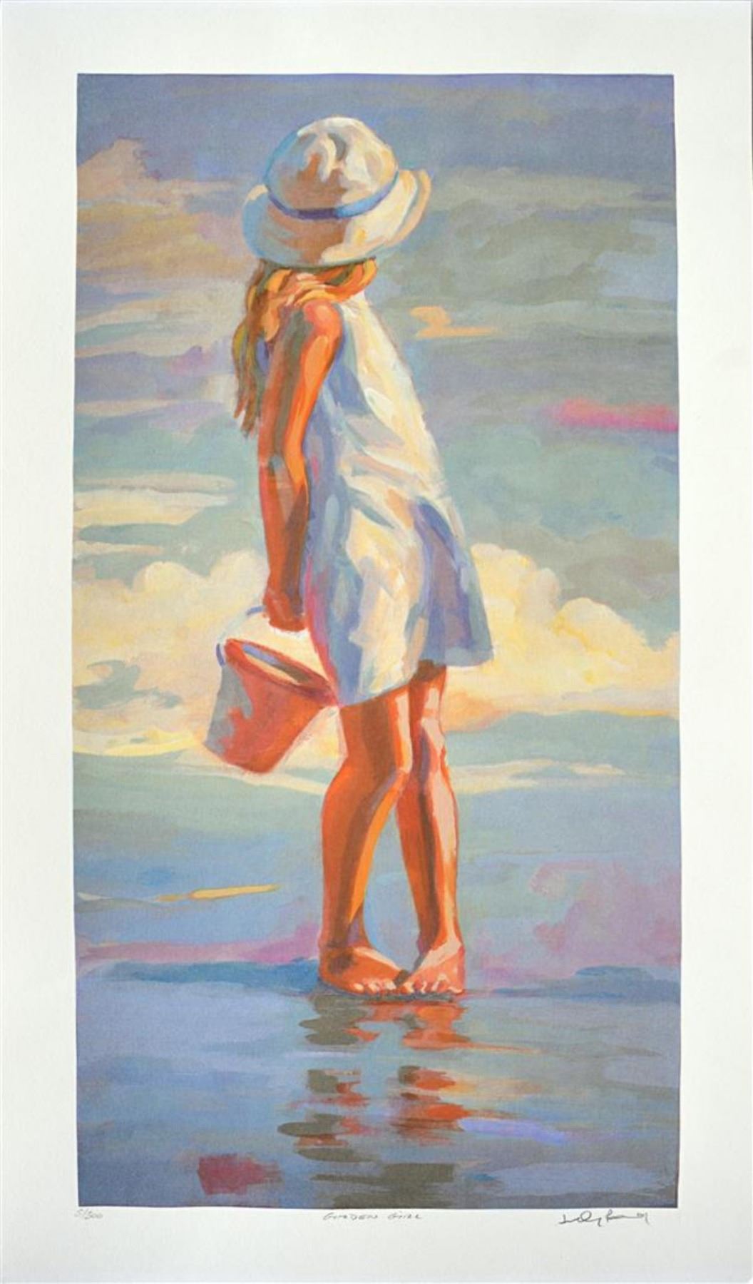 Artist: Lucelle Raad (b. 1942) - Title: Golden Girl - Medium: Serigraph on Fine Art Paper - Signature: Hand-signed by the Artist - Limited Edition: 300 - Image Size: Approximately 25 Inches x 12.5 inches - Paper Size: Approximately 28.5 inches x 15.75 inches - Unframed - Details: This work comes with a Certificate of Authenticity - Biography: Many are touched by Lucelle's blending of the hopeful innocence of children in a commonplace setting. Each case awakens nostalgia for that youthful honesty and simplicity in all that view her work. The recipient of multiple awards, her most prized award was received at the world famous Washington Square Art Exhibit, an annual event in New York which is an invitational, juried show with over 500 artists from every corner of the globe. Lucelle's art graces many corporate, public, and private collections in every state in the union and in countries around the world.
