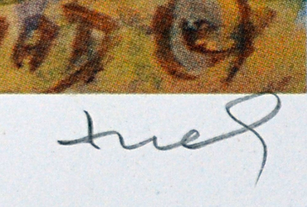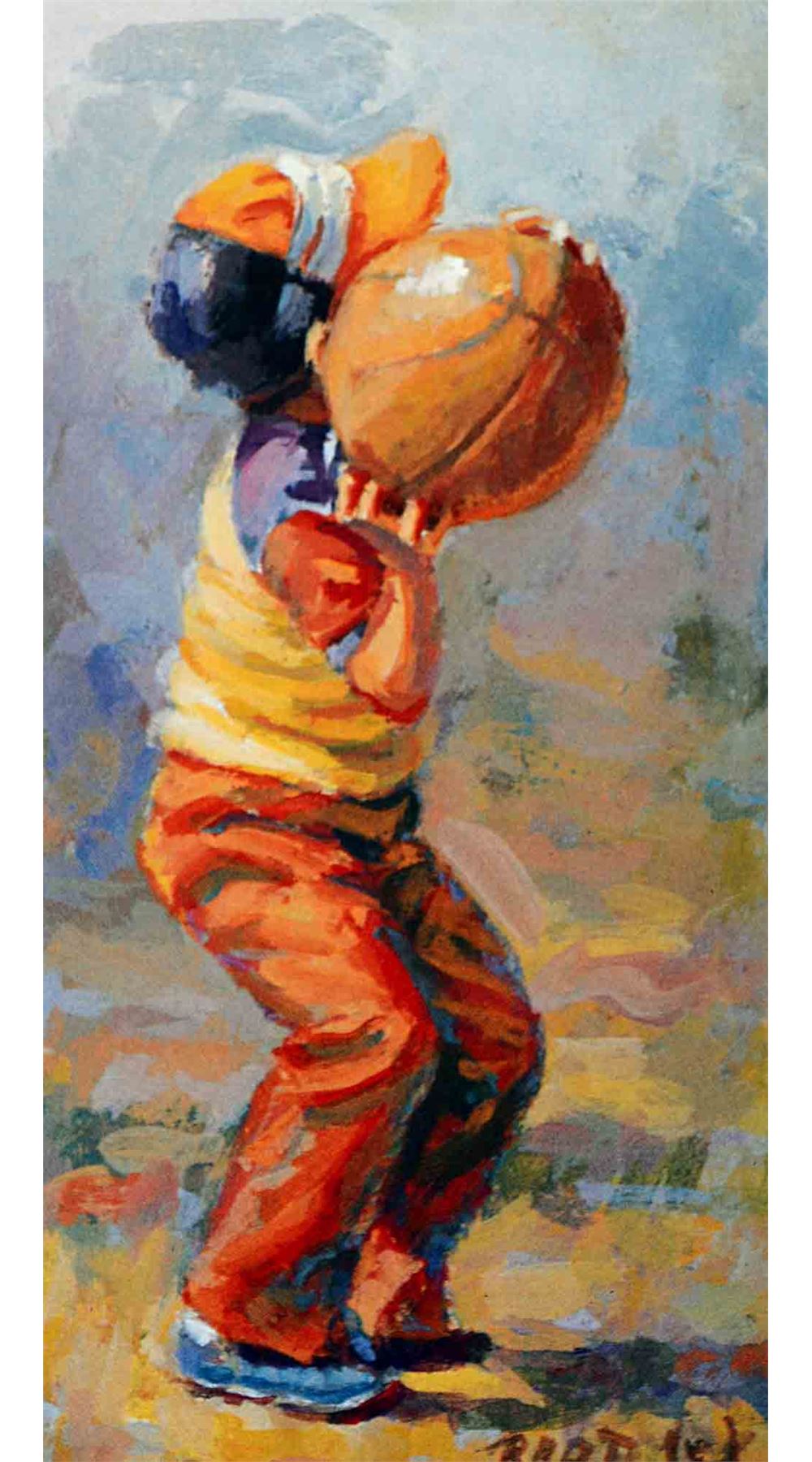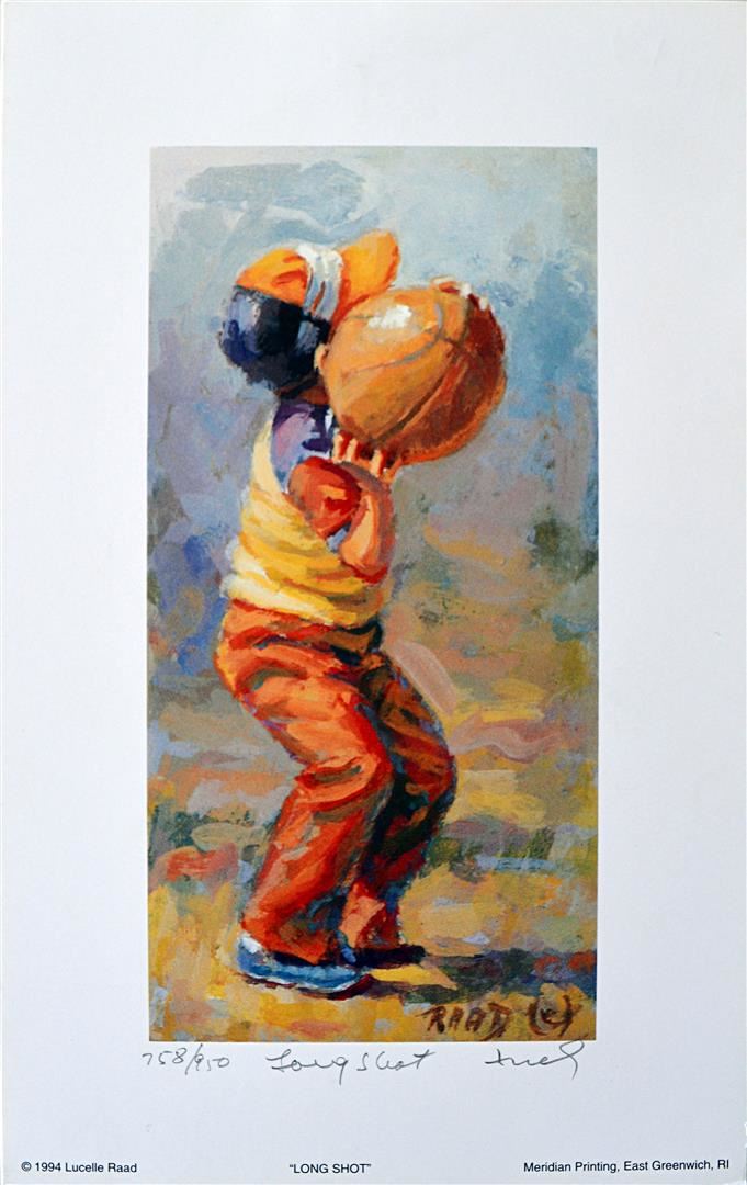 Artist: Lucelle Raad (b. 1942) - Title: Long Shot - Medium: Offset Lithograph on Paper - Signature: Hand-signed by the Artist - Limited Edition: 950 - Image Size: Approximately 6 Inches x 3 inches - Paper Size: Approximately 8 inches x 5 inches - Unframed - Details: This work comes with a Certificate of Authenticity - Biography: Many are touched by Lucelle's blending of the hopeful innocence of children in a commonplace setting. Each case awakens nostalgia for that youthful honesty and simplicity in all that view her work. The recipient of multiple awards, her most prized award was received at the world famous Washington Square Art Exhibit, an annual event in New York which is an invitational, juried show with over 500 artists from every corner of the globe. Lucelle's art graces many corporate, public, and private collections in every state in the union and in countries around the world.