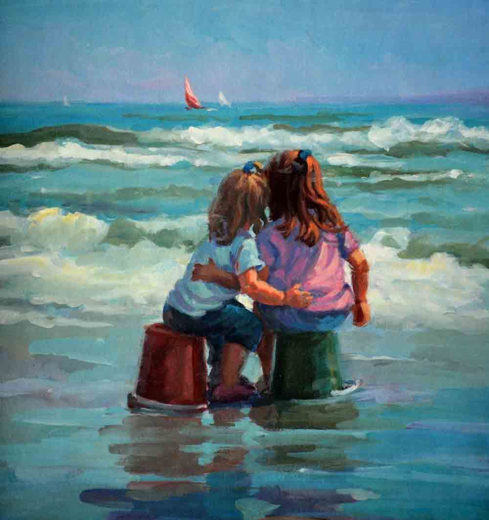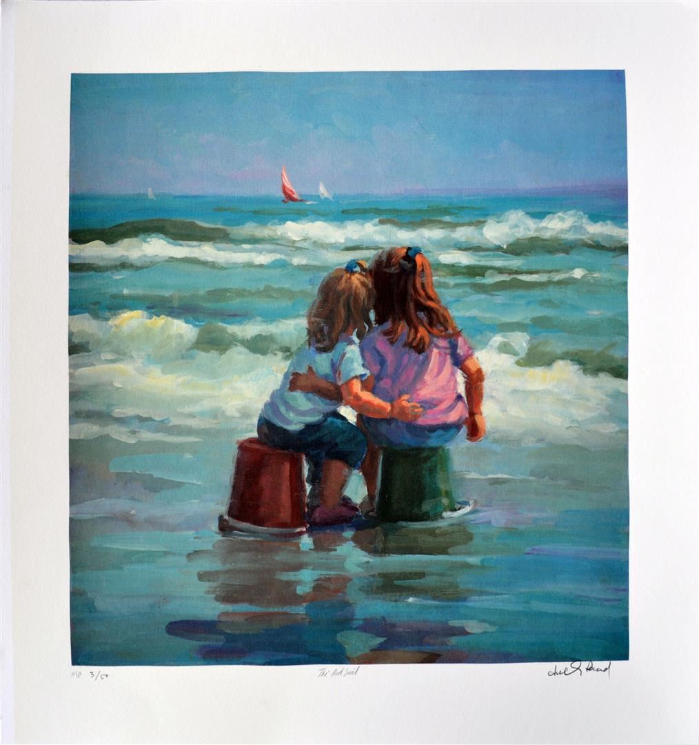 Artist: Lucelle Raad (b. 1942) - Title: The Red Sail - Medium: Serigraph on Fine Art Paper - Signature: Hand-signed by the Artist - Limited Edition: AP 50 - Image Size: Approximately 16 Inches x 15 inches - Paper Size: Approximately 20 inches x 18.75 inches - Unframed - Details: This work comes with a Certificate of Authenticity - Biography: Many are touched by Lucelle's blending of the hopeful innocence of children in a commonplace setting. Each case awakens nostalgia for that youthful honesty and simplicity in all that view her work. The recipient of multiple awards, her most prized award was received at the world famous Washington Square Art Exhibit, an annual event in New York which is an invitational, juried show with over 500 artists from every corner of the globe. Lucelle's art graces many corporate, public, and private collections in every state in the union and in countries around the world.