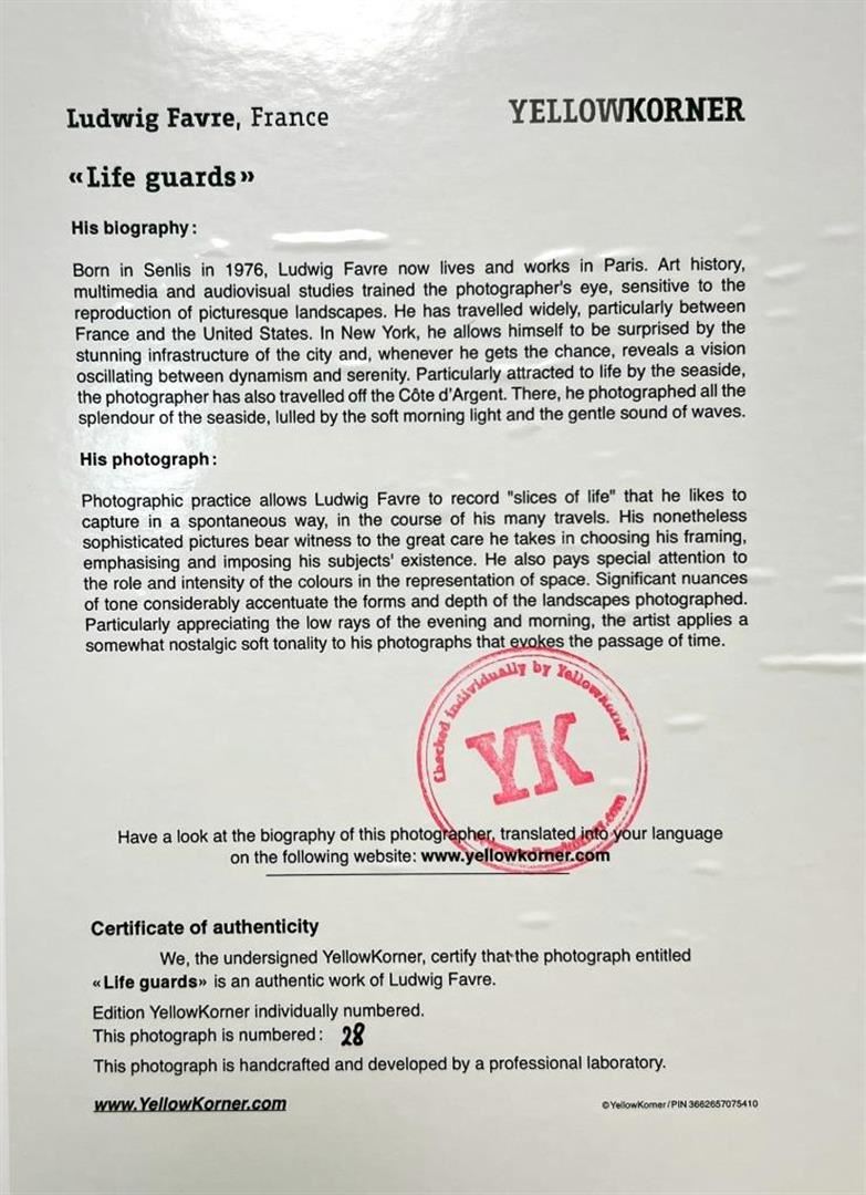 Ludwig Favre France Life Guards YellowKorner Certified Photograph. Certificate of Authenticity from YellowKorner affixed to the back. Matted Dimensions 16"x20". Protected with Clear Mylar Sleeve.