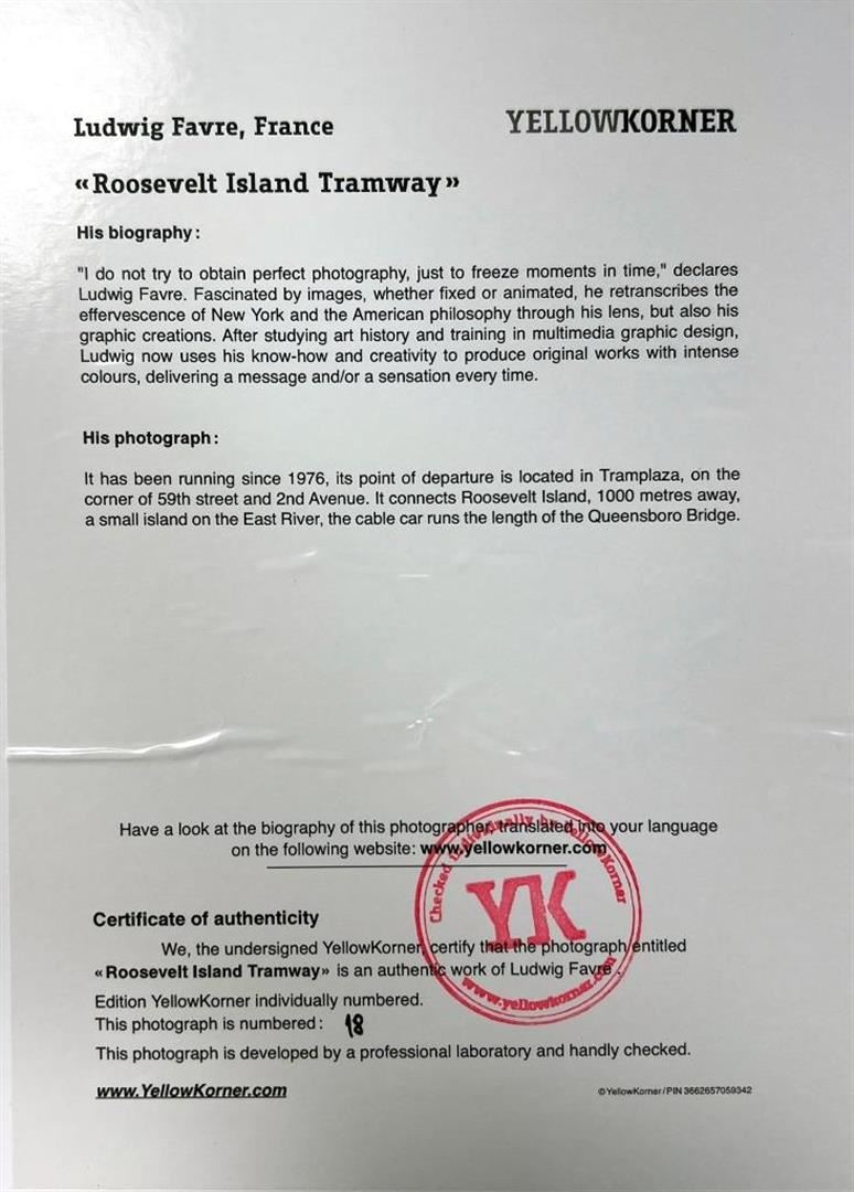 Ludwing Favre France Roosevelt Island Tramway YellowKorner Certified Photograph. Certificate of Authenticity from YellowKorner affixed to the back. Matted Dimensions 16"x20". Protected with Clear Mylar Sleeve.