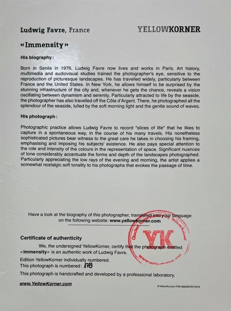 Ludwing Favre France Inmensity YellowKorner Certified Photograph. Certificate of Authenticity from YellowKorner affixed to the back. Matted Dimensions 16"x20". Protected with Clear Mylar Sleeve.