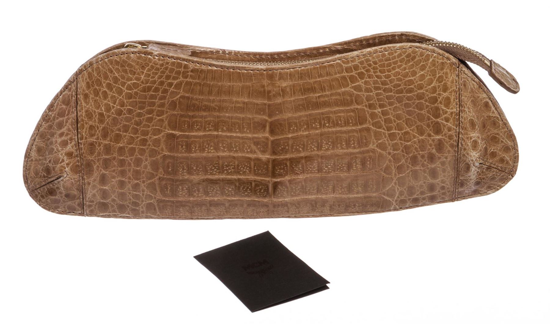 Beige crocodile MCM evening clutch with gold tone hardware, leather interior lining, zipper pocket at interior wall and a overall zipper closure.