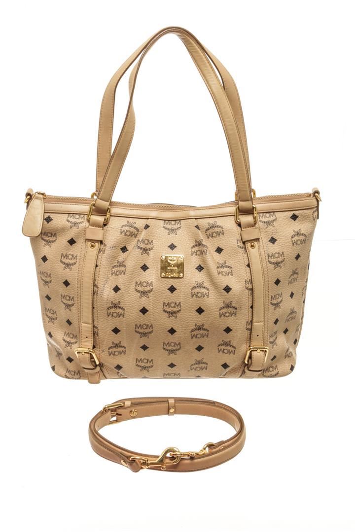 One MCM Beige Leather Visetos Shoulder Bag. Item is sold AS-IS. All available information is listed in the description and shown in the photo. Gucci Black Leather Small Miss Hobo Bag with this shoulder strap, gold tone hardware, detachable adjustable strap, MCM satin lining, two interior slip pockets, zipper closure. Height: 8.1" Width: 10.4" Depth: 4.5", Handle Drop: / 20.57 x 26.41 x 11.43 Cm