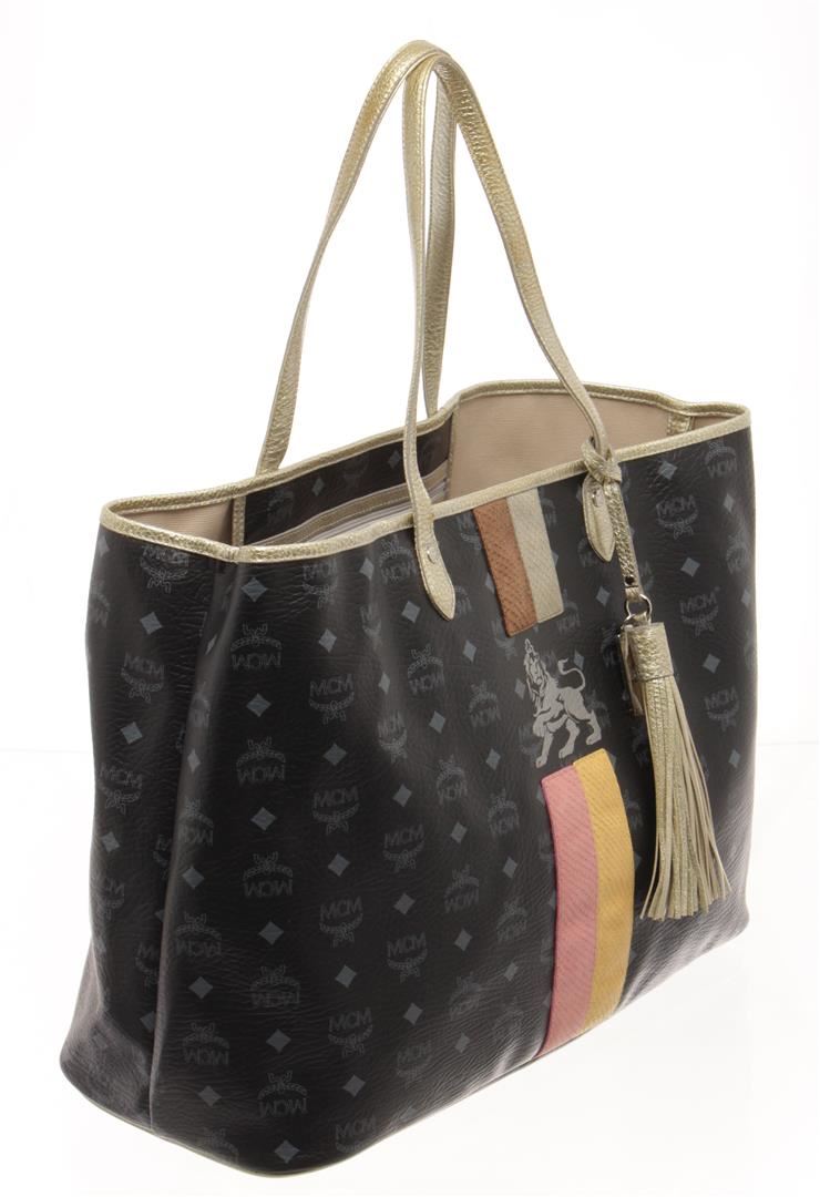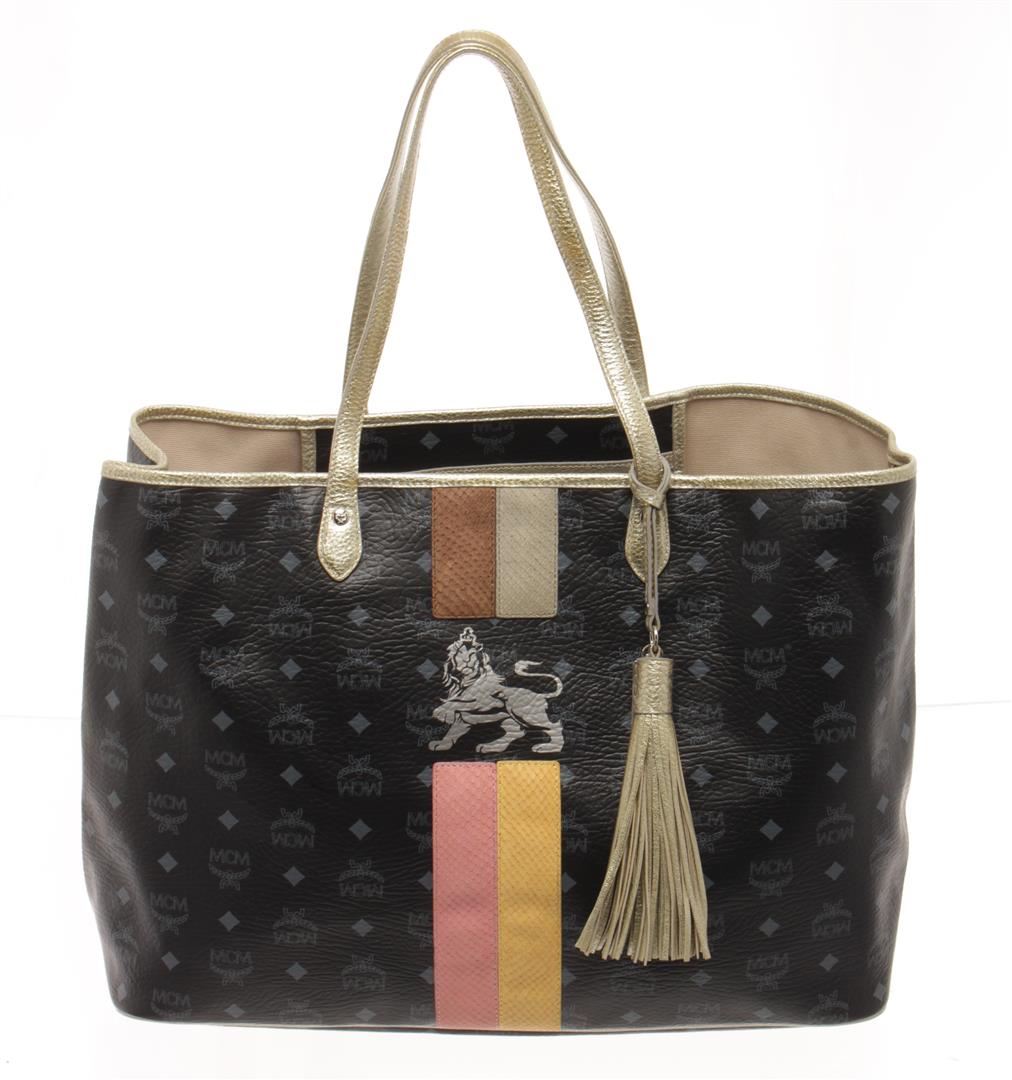 One MCM Black Visetos Leather Striped Lion Shopper Bag. Item is sold AS-IS. All available information is listed in the description and shown in the photo. MCM Black Visetos Leather Striped Lion Shopper Bag with black leather logo patterned exterior, multicolor stripes with a silver lion on front center, gold leather trims, top handles, and tassel; beige canvas lining, open top, gold-tone hardware, and one interior zip pocket.