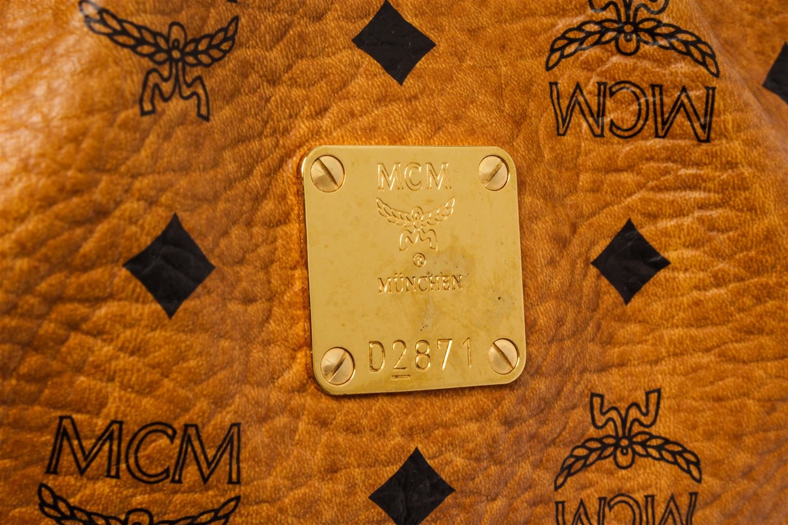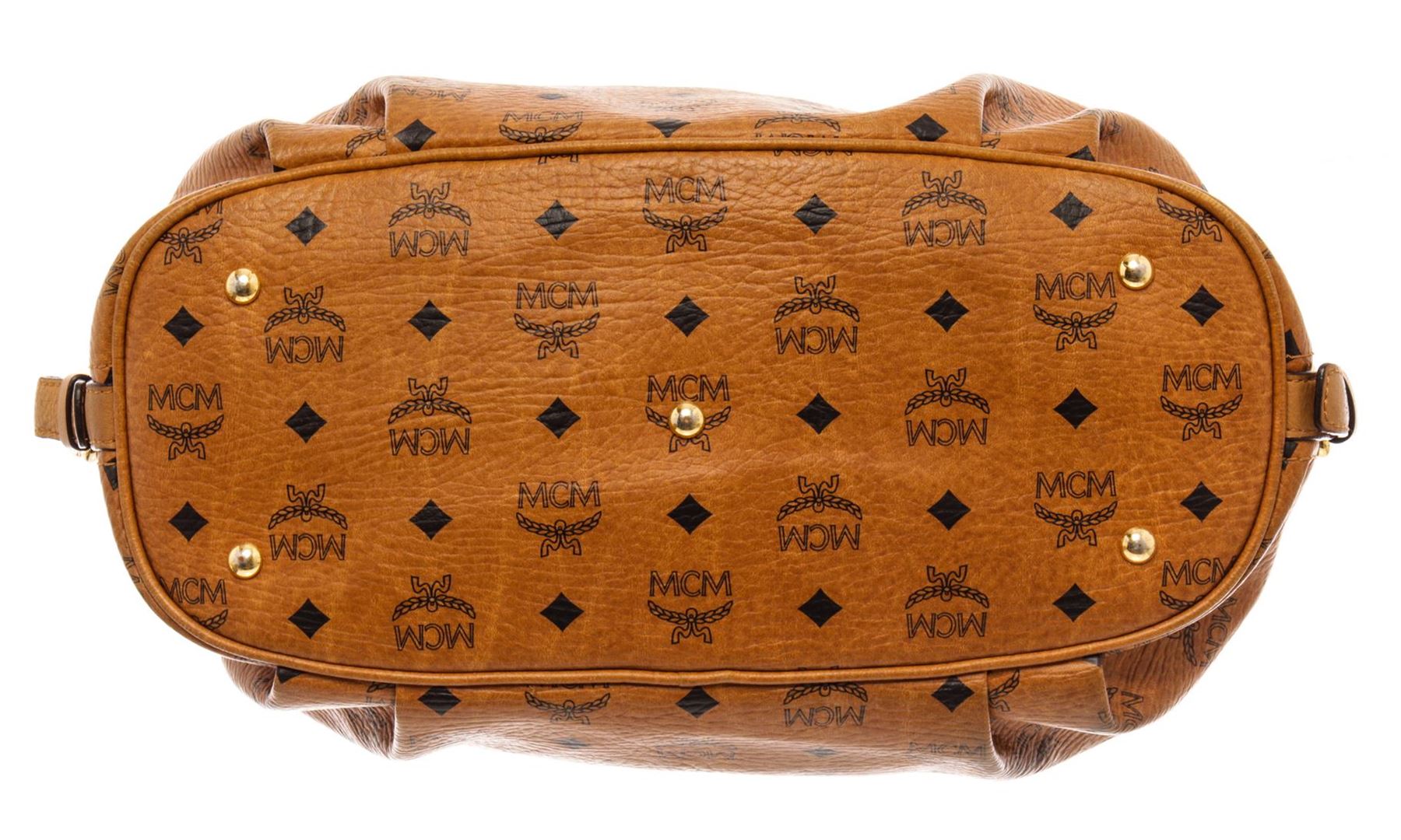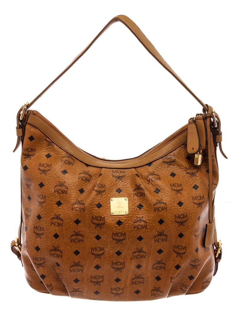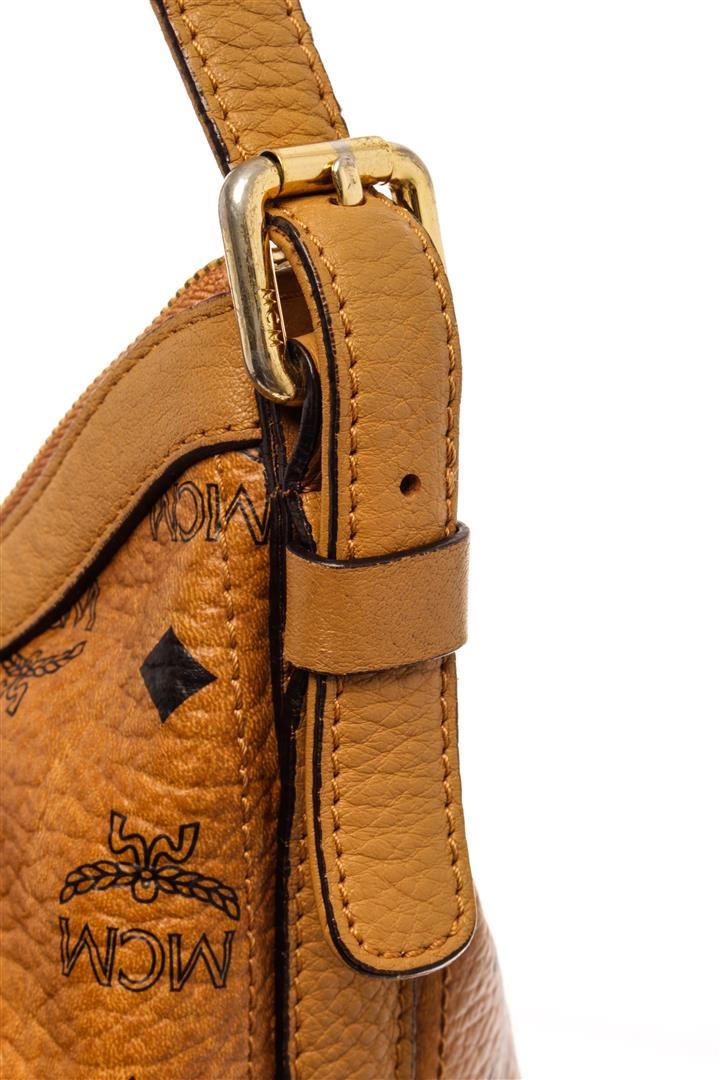 MCM Brown Canvas Leather Hobo Bag. All available information is listed in the description and shown in the photos. MCM Brown Canvas Leather Hobo Bag with gold-tone hardware, leather trim, single adjustable shoulder strap, leather trim embellishment, twill lining & three interior pockets, zip closure at top. Height: 10", Width: 12.5", Depth: 4.5" / 25.4 x 31.75 x 11.43 CM