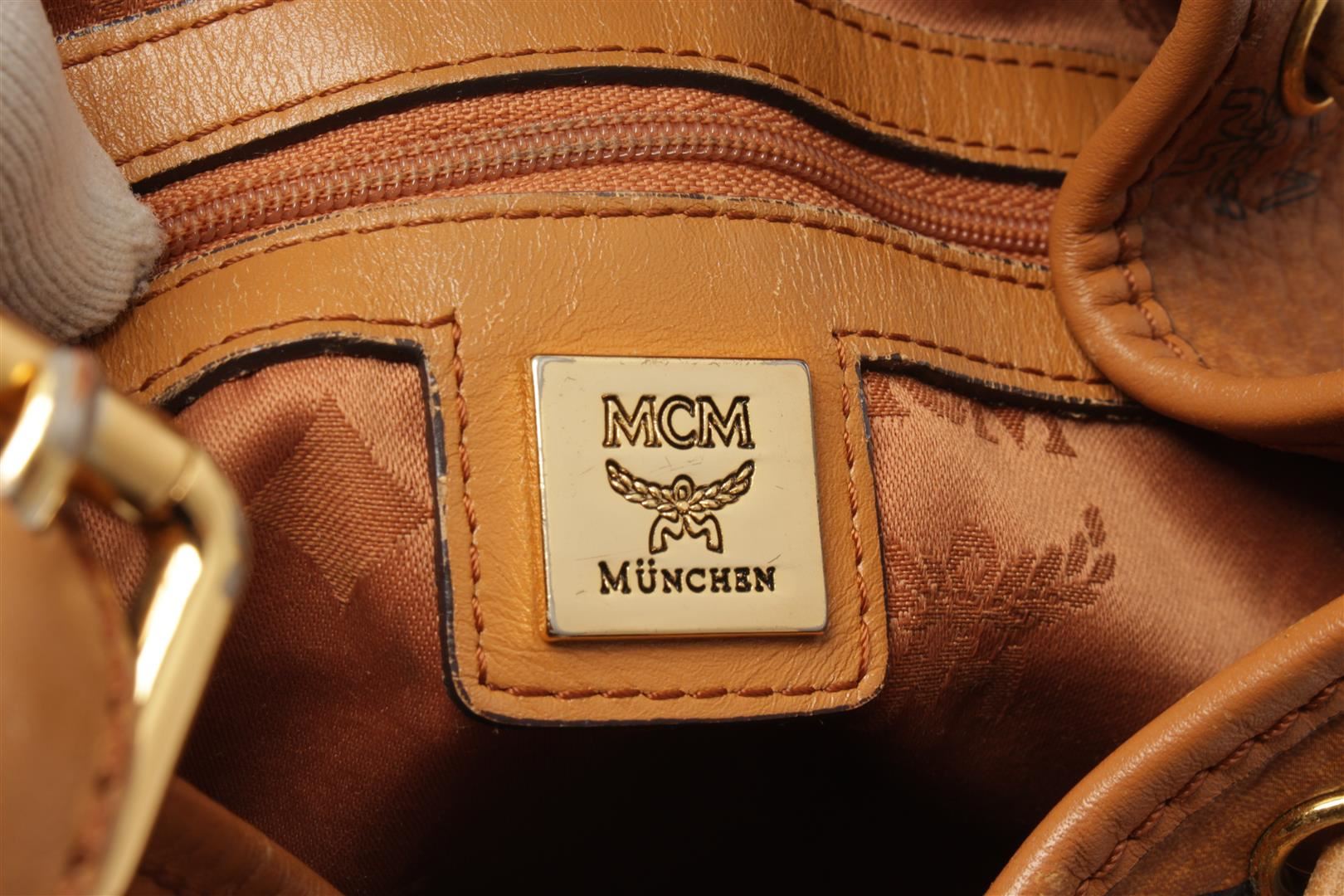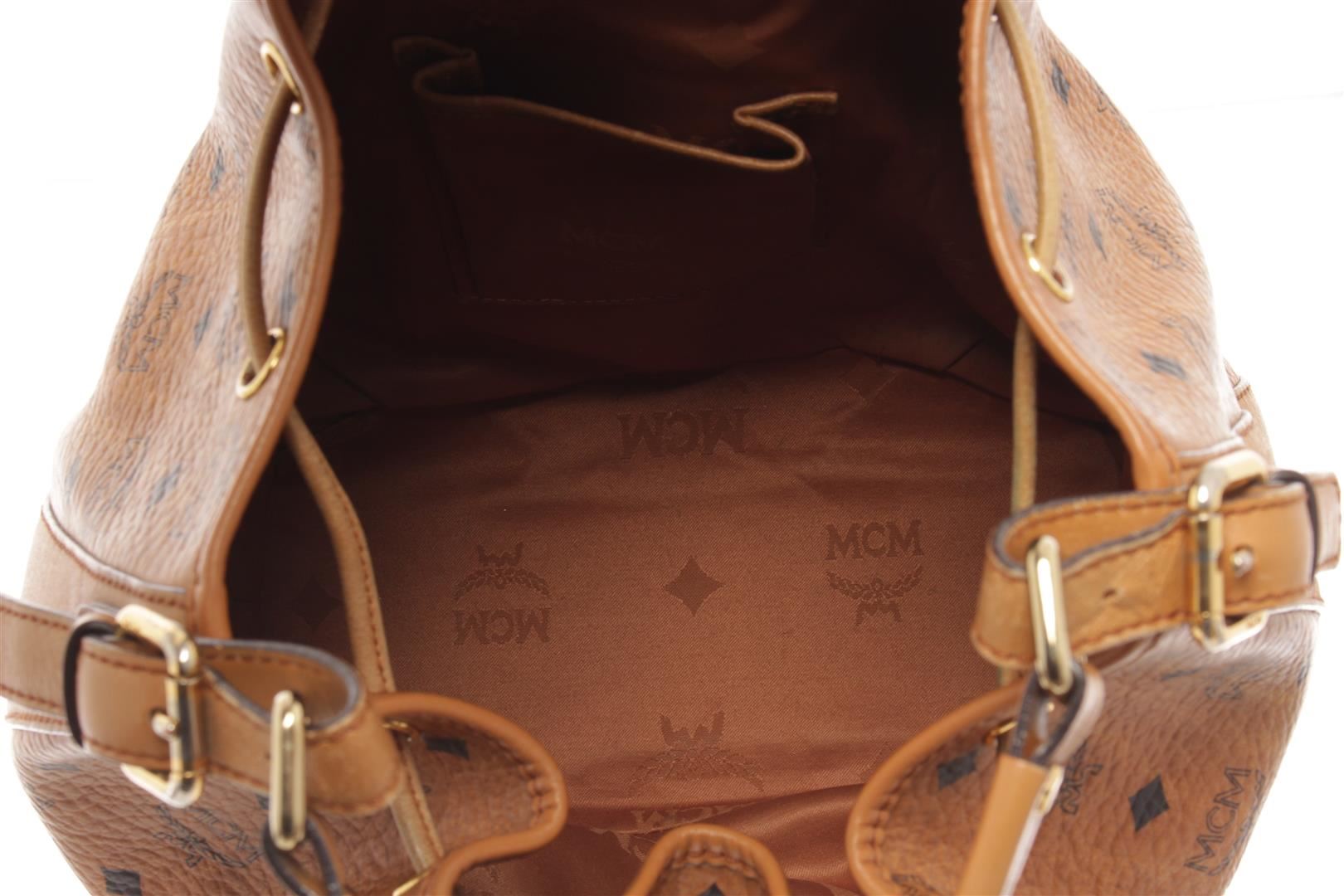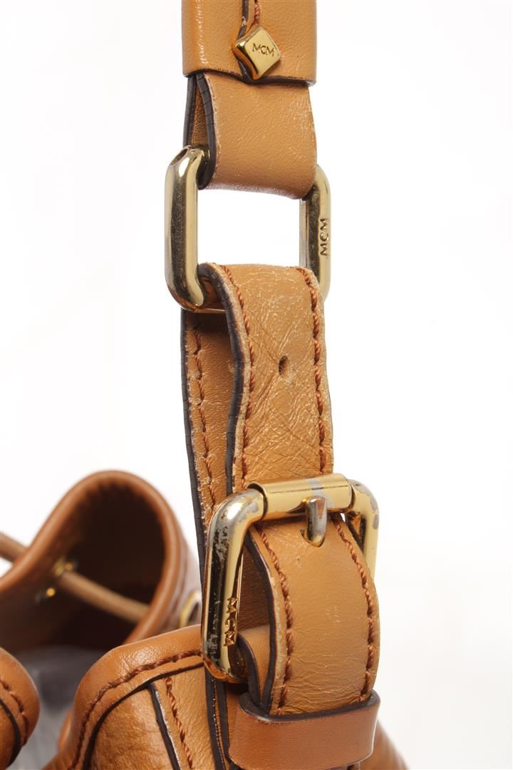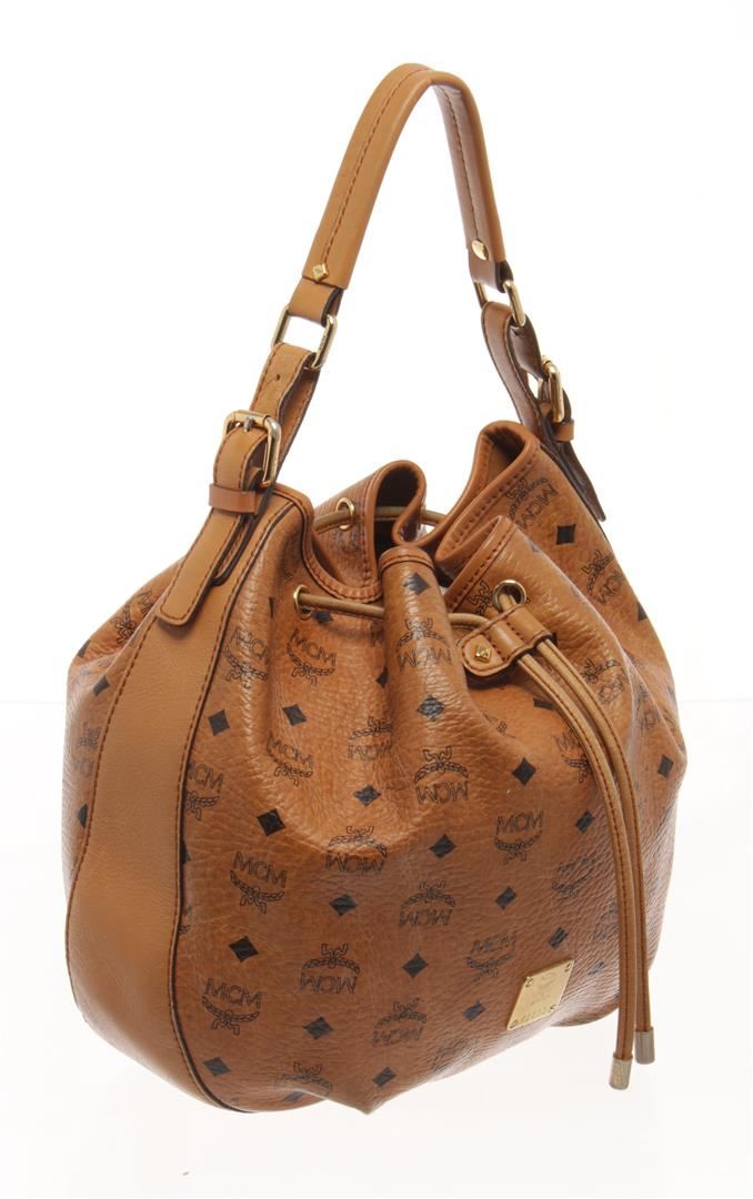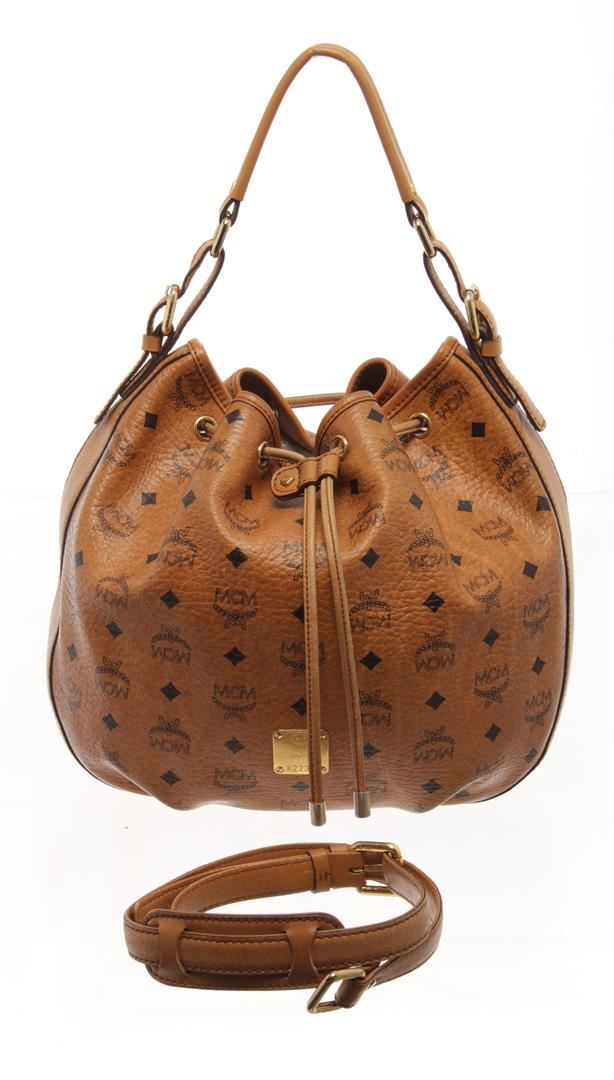 One MCM Cognac Visetos Leather Bucket Bag. Item is sold AS-IS. All available information is listed in the description and shown in the photo. MCM Cognac Visetos Leather Bucket Bag with dark gold-toned hardware, interior side zip pocket and open pocket, visetos coated canvas and trimmed in rich nappa leather, drawstring fastening with concealed magnetic closure, removable top handle, removable leather crossbody strap, drawstring closure. There are a few scratches on the leather. Please refer to photos. 10.2" x 9.1" x 5.5" inches / 4.01 x 3.58 x 2.16 cm
