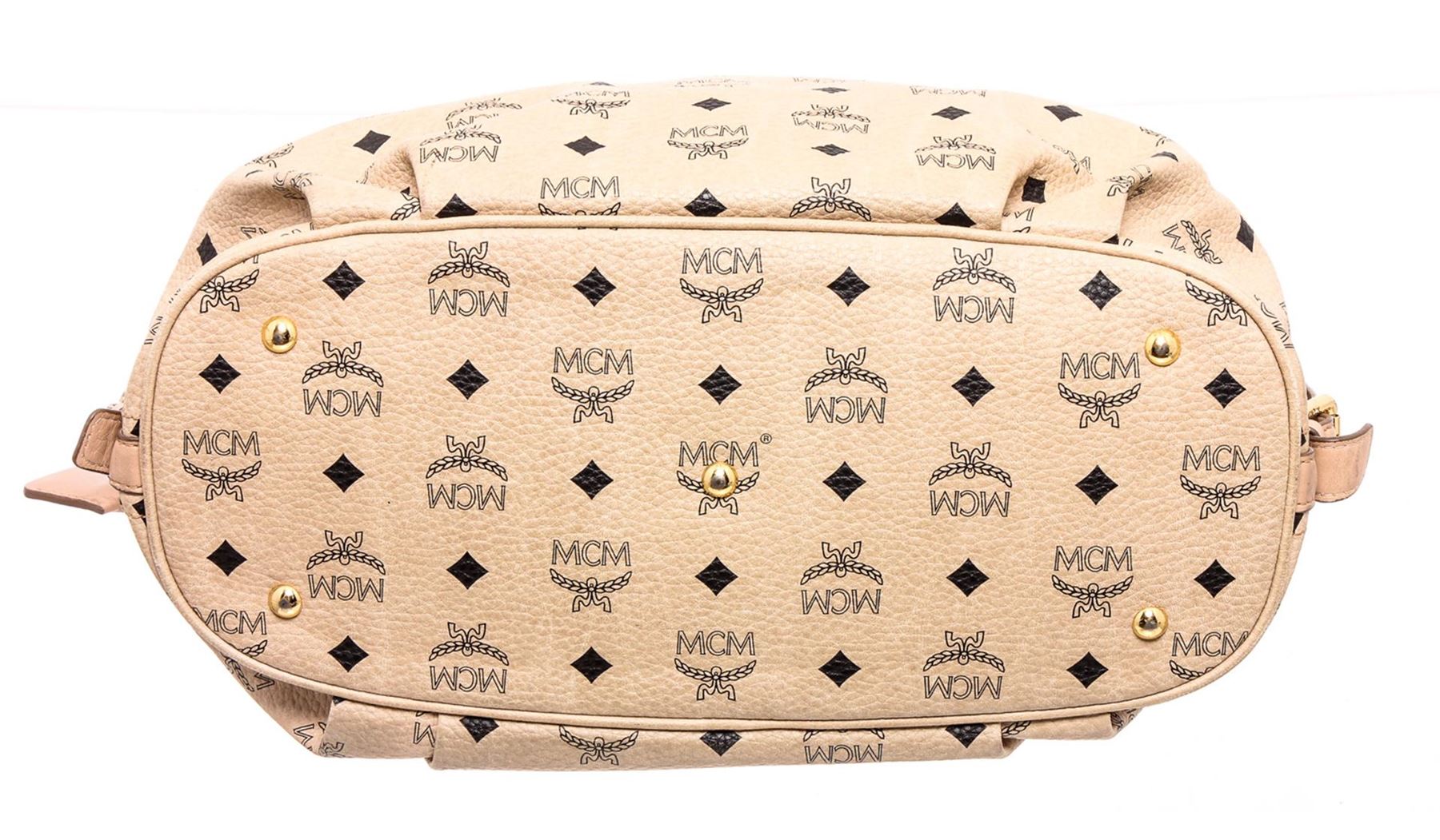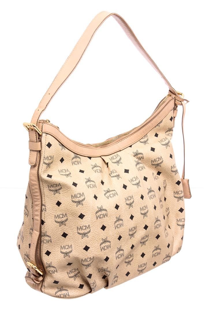 MCM cream coated canvas Visetos Hobo shoulder bag with gold-tone hardware, single flat leather shoulder strap, protective feet at base, brown logo canvas lining, three interior pockets, one with zip closure and overall zip closure at top.