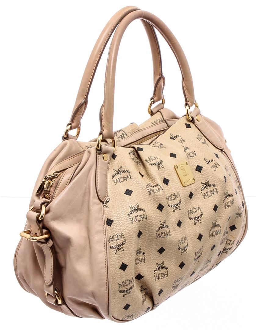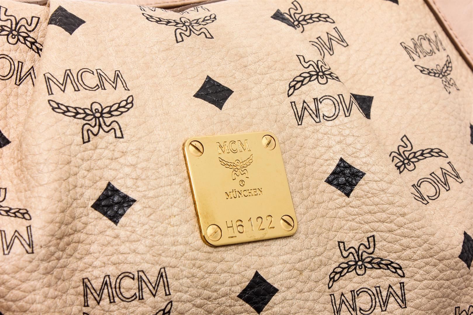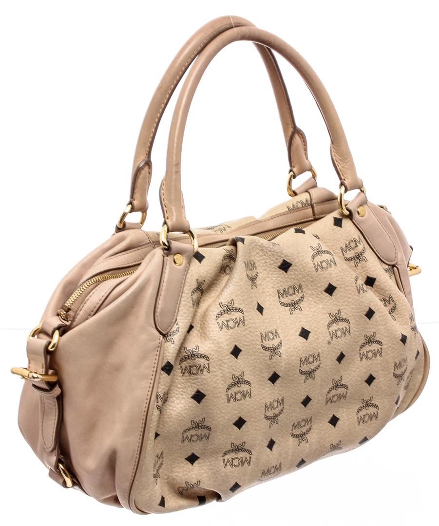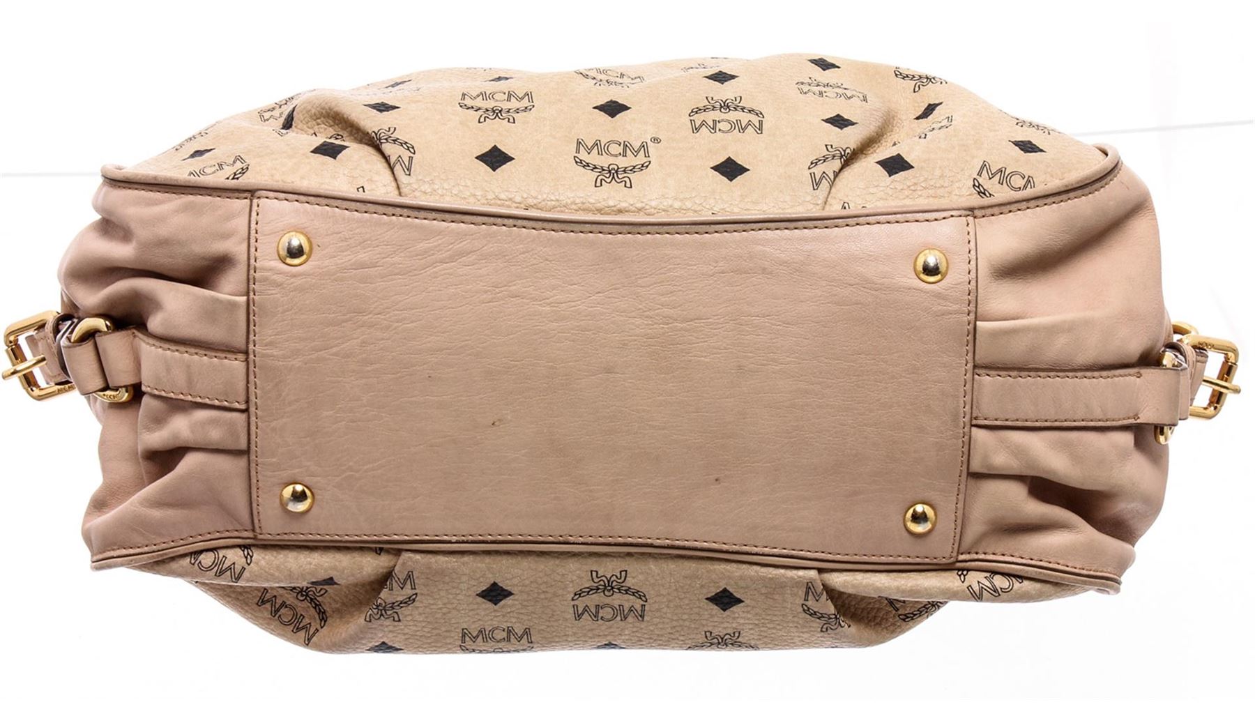 MCM cream coated canvas Visetos shoulder bag with gold-tone hardware, dual rolled top handles, protective feet at base, brown logo woven lining, three interior pockets, one with zip closure and overall zip closure at top.